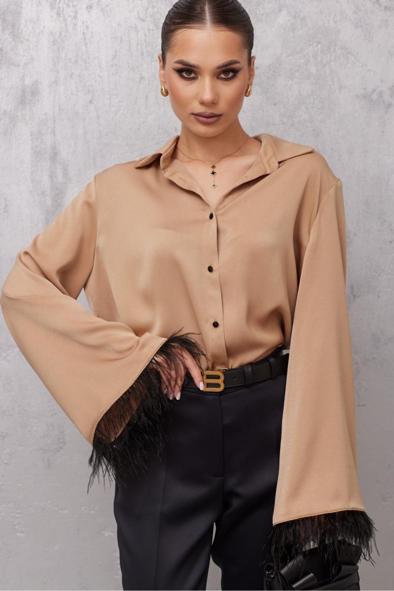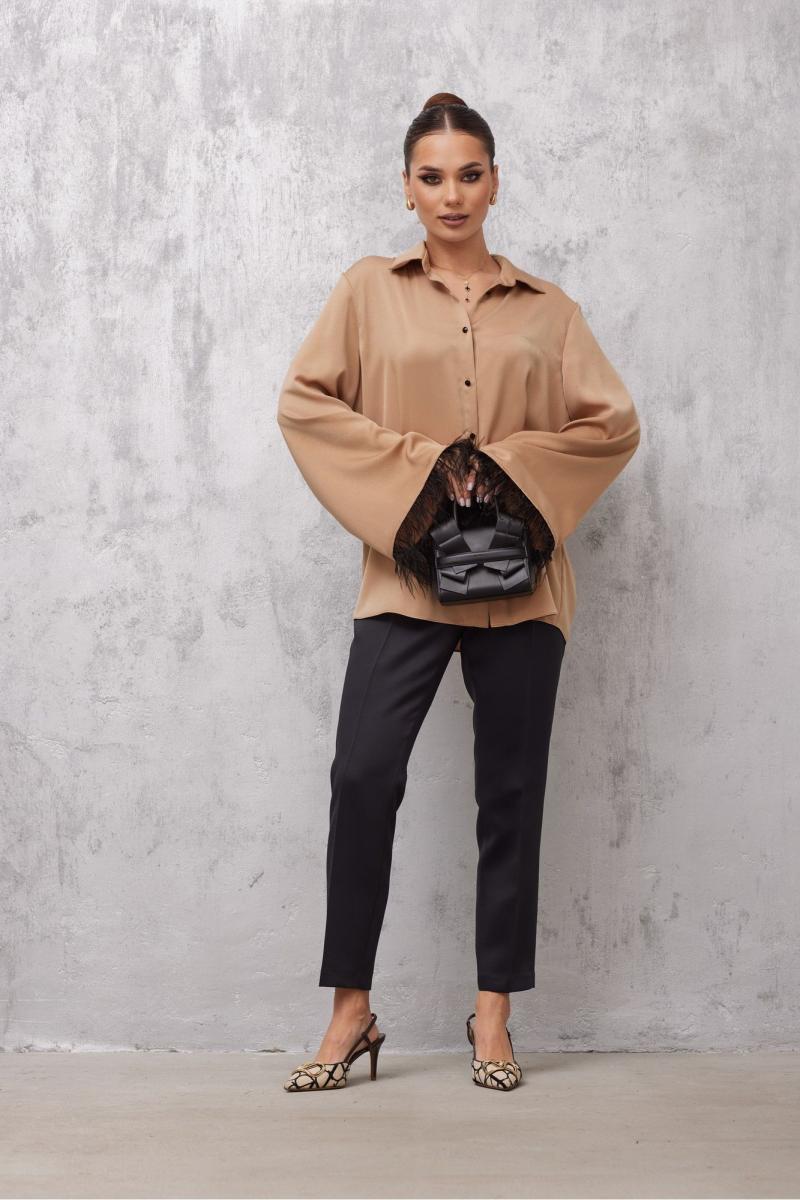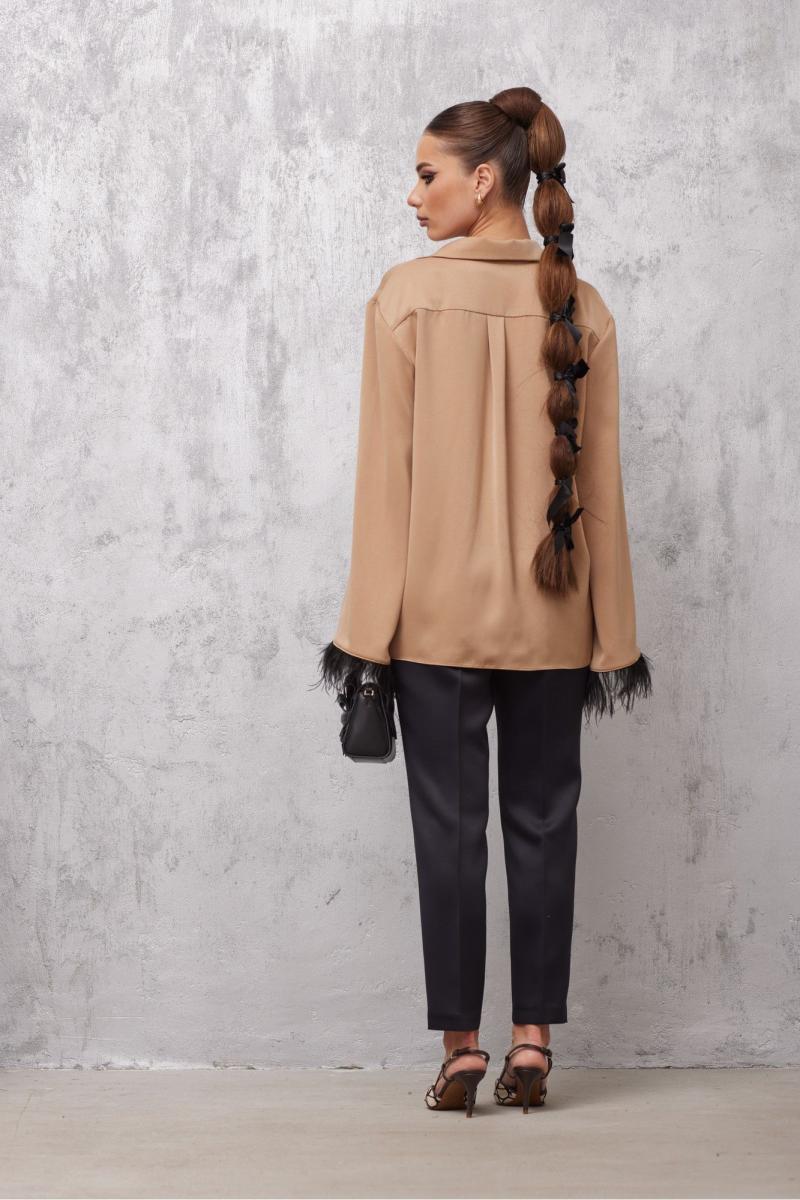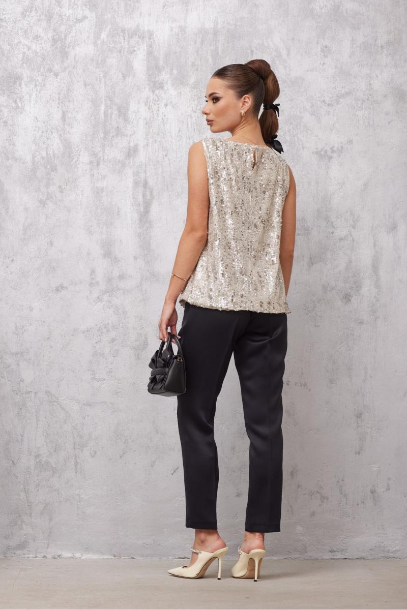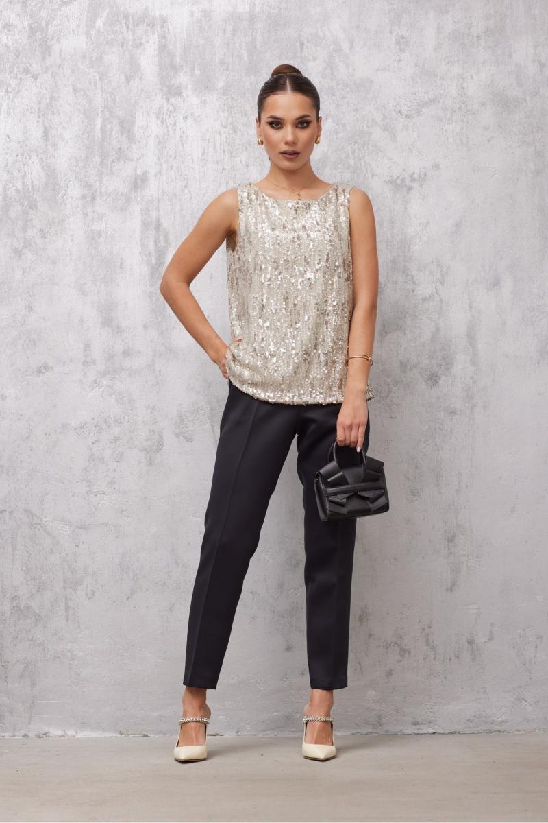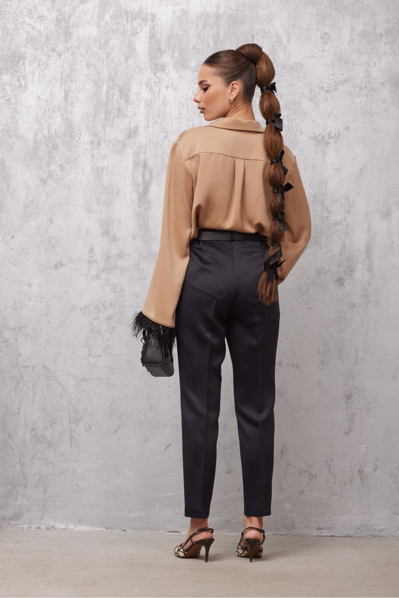 Брюки из костюмной ткани зауженные книзу. Верх на поясе со шлевками. По боковым частям пояса вставлена резинка. Застежка по переду на молнию и пуговицу на поясе. В боковых швах карманы.
