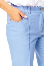 Брюки прямого силуэта с центральной застёжкой на молнию и петлю-пуговицу. По передним половинкам застрочены канты.В боковых швах карманы с отрезным бочком.Задние половинки с отрезными кокетками и накладными карманами. Застежка спереди на молнию и пуговицу. Пояс притачной с резинками по бокам. Отделочные строчки контрастного цвета