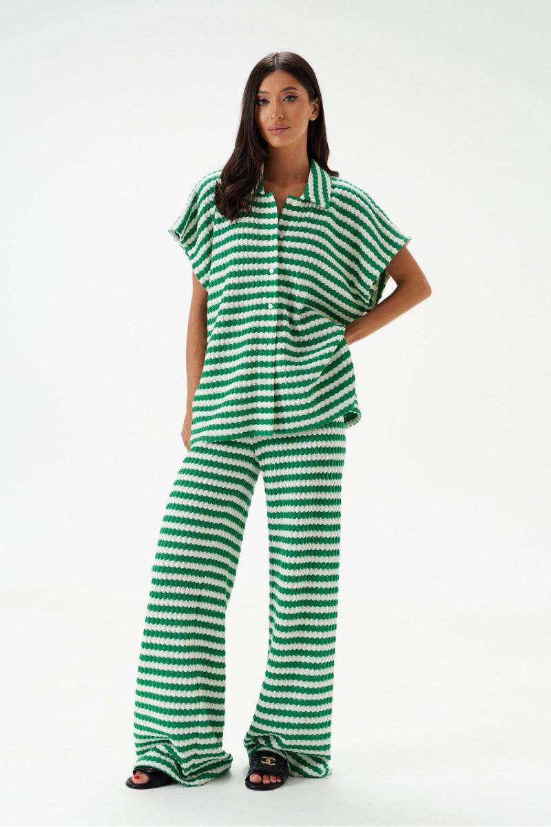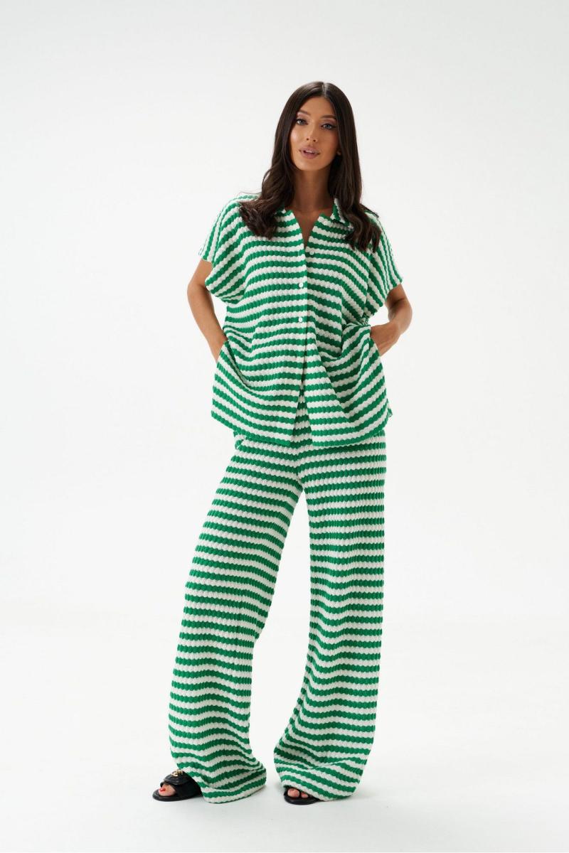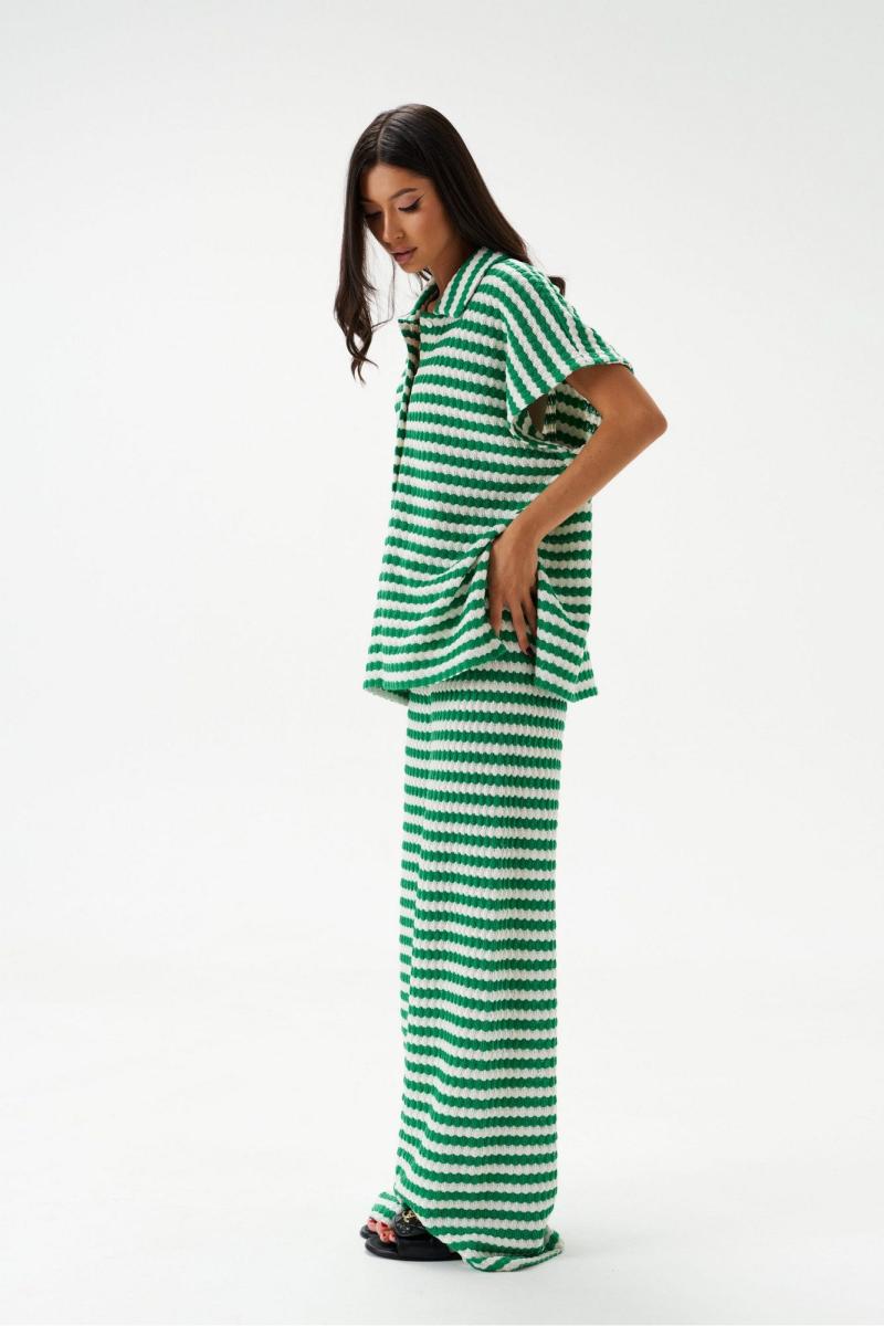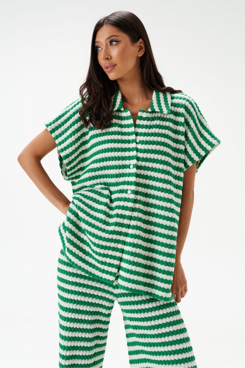 Джемпер свободного кроя. Выполнен из мягкого вязаного трикотажа. Воротник отложной. Вырез горловины круглый. Рукав цельнокроеный, спущенный. В боковых швах разрезы 21 см. Застёжка центральная – пуговицы. Длина рукава от горловины 29 см. Длина спинки 68 см