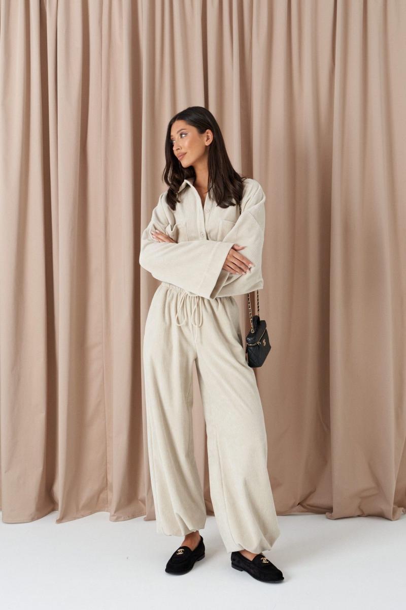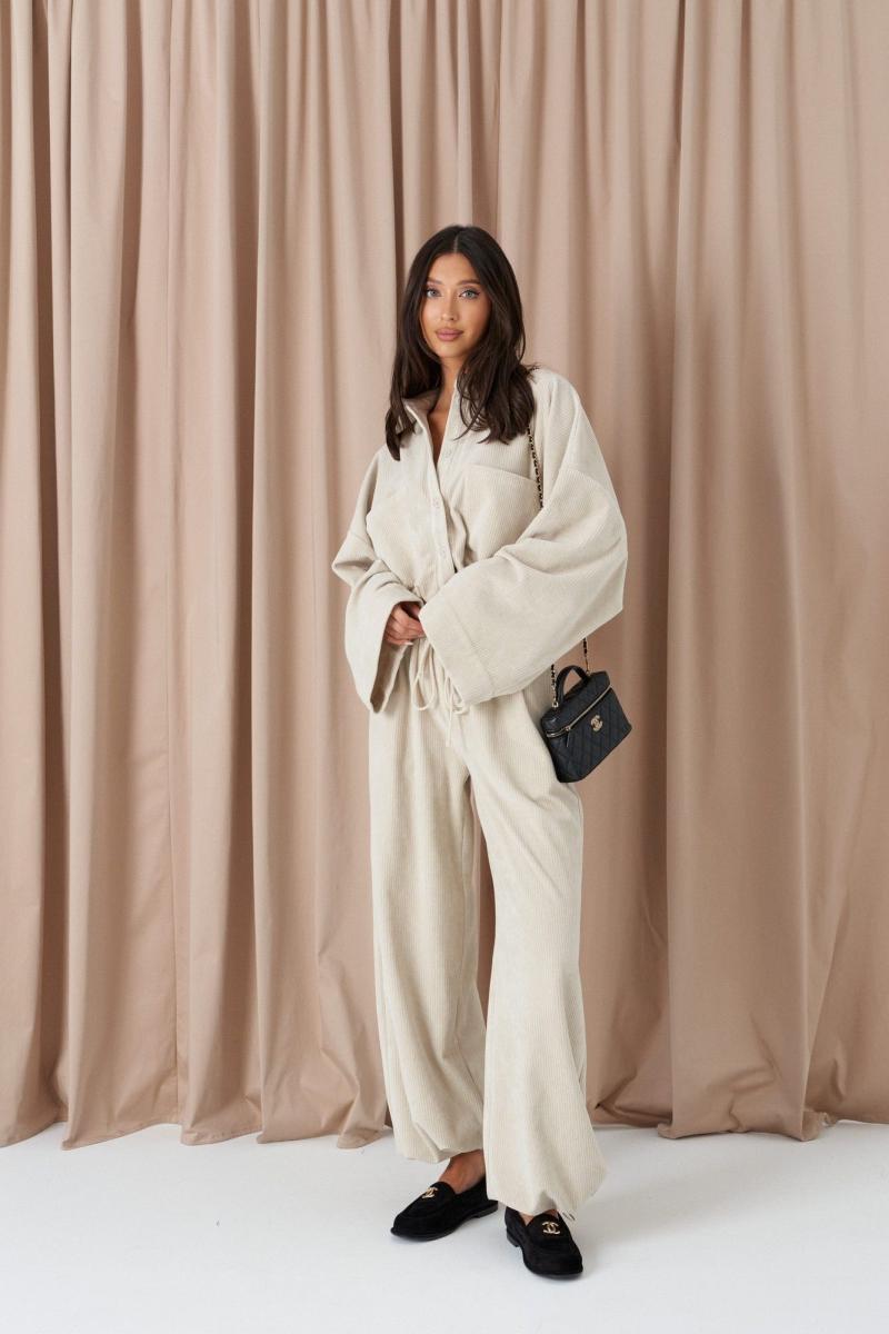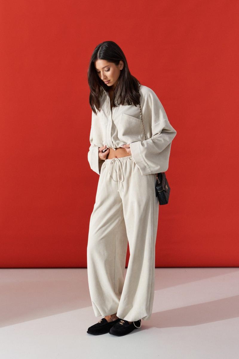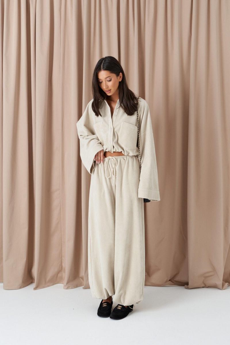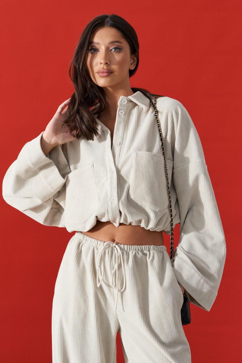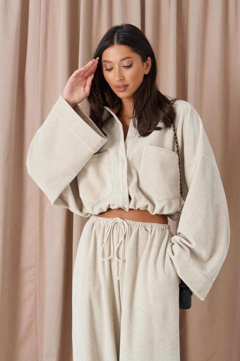 Джемпер прямого свободного кроя выполне из штрукса молочного цвета. Характеристики: прямой крой, отложной воротник, застежка центральная на петли-пуговицы, рукав втачной спущенный, манжет широкий, по низу изделие собирается на резинку с фиксаторами, по переду изделия крупные накладные карманы. Длина рукава от края горловины 78см, длина по спинке 47см.