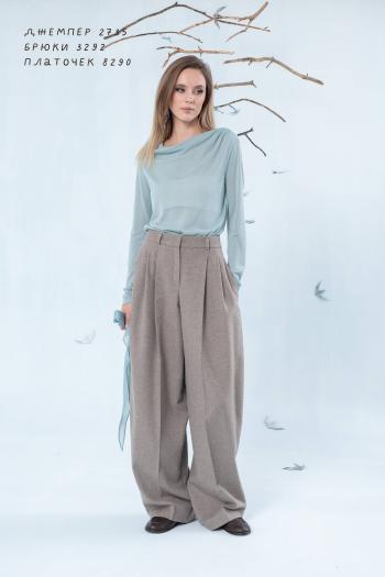 Джемпер свободного кроя, выполнен из трикотажного полотна молочного цвета. Характеристика: воротник вточной отложной, центральная застежка на петли-пуговицы, чуть спущенное плечо, рукав втачной, короткий. Длина по центру спинки 63см. Длина рукава от края горловины 41см.