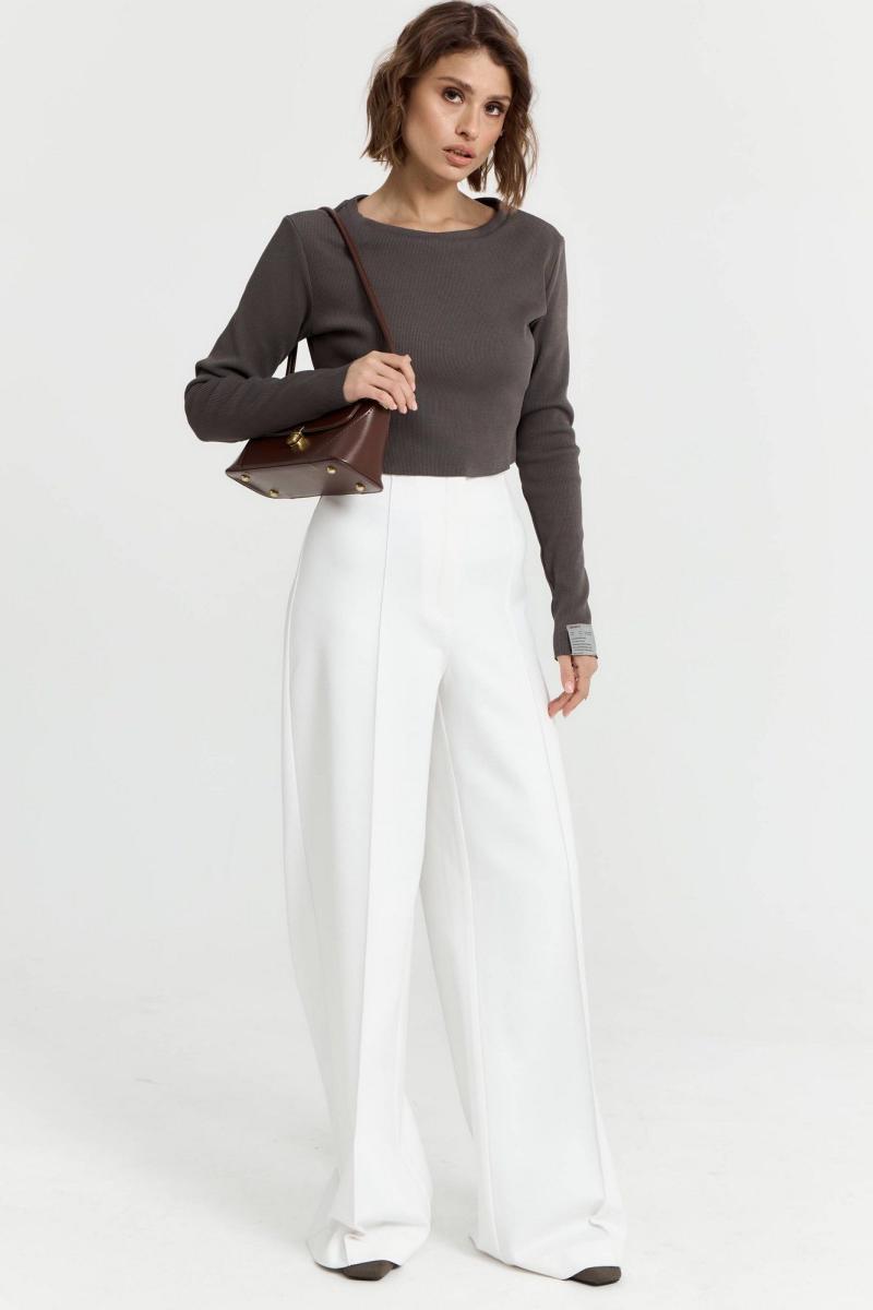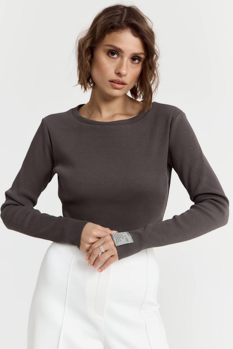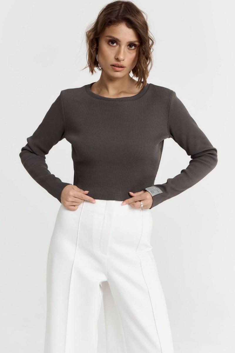 Джемпер укороченный, полуприлегающего силуэта, горловина округлая, рукав втачной, внизу правого рукава небольшая нашивка. Длина по спинке - 37см. Длина рукава - 62см.