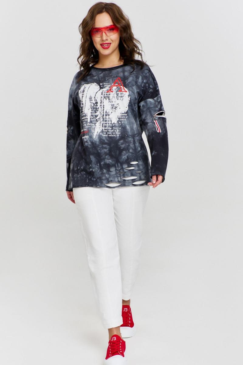 Свитшот из хлопкового футера 2-х нитки с эффектом "тай-дай", свободного силуэта, с длинным рукавом и круглой горловиной. Линия плеча спущена, на рукавах прорези с молниями. Горловина с притачной бейкой с сырым срезом. По низу изделия прорези. Перед декорирован авторским принтом.