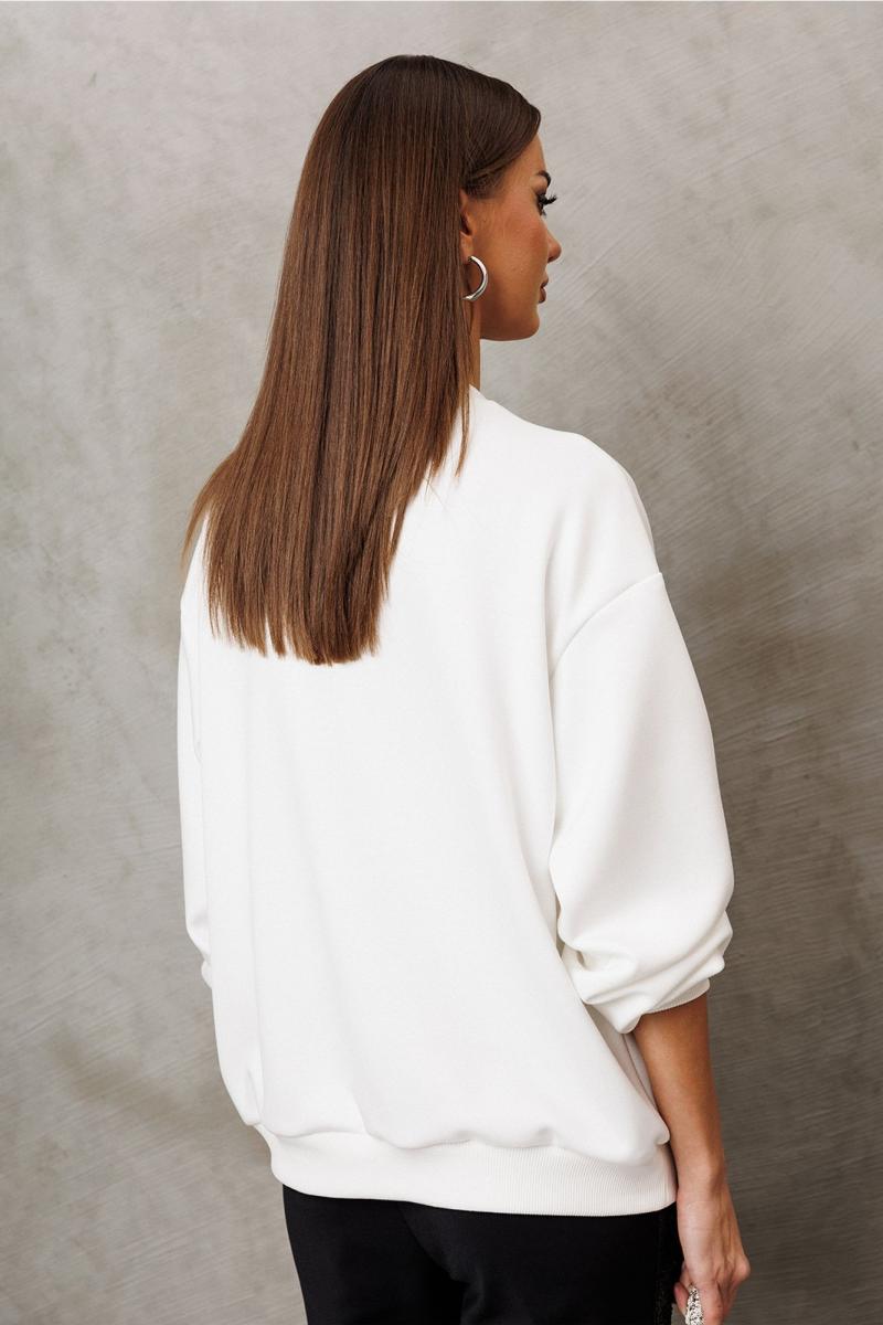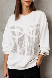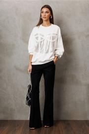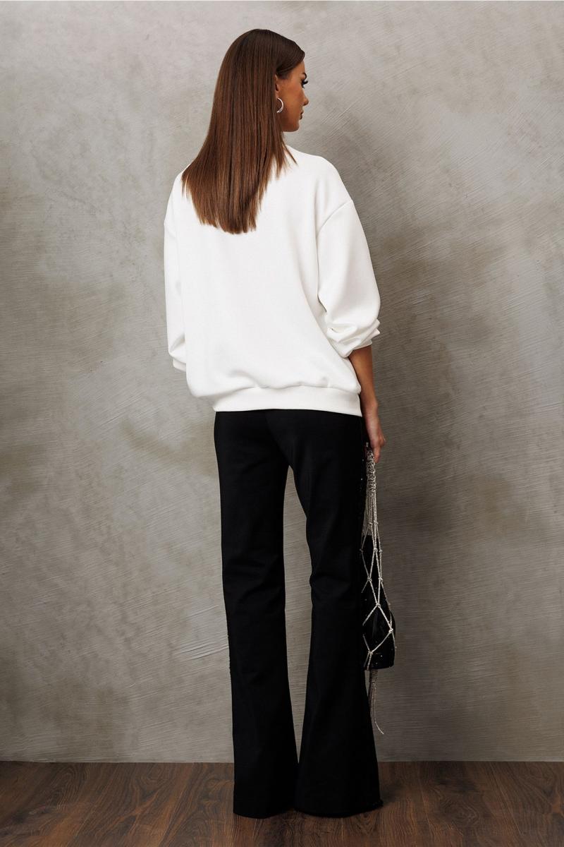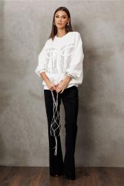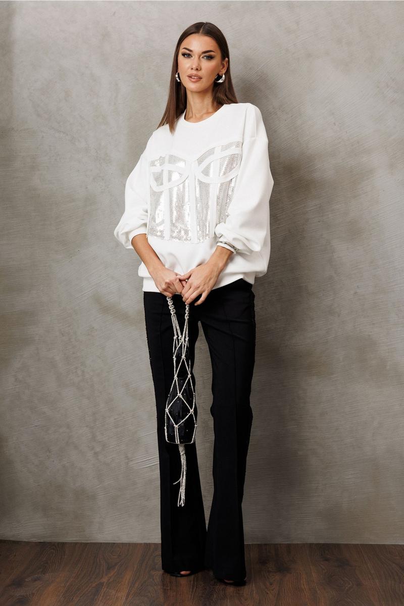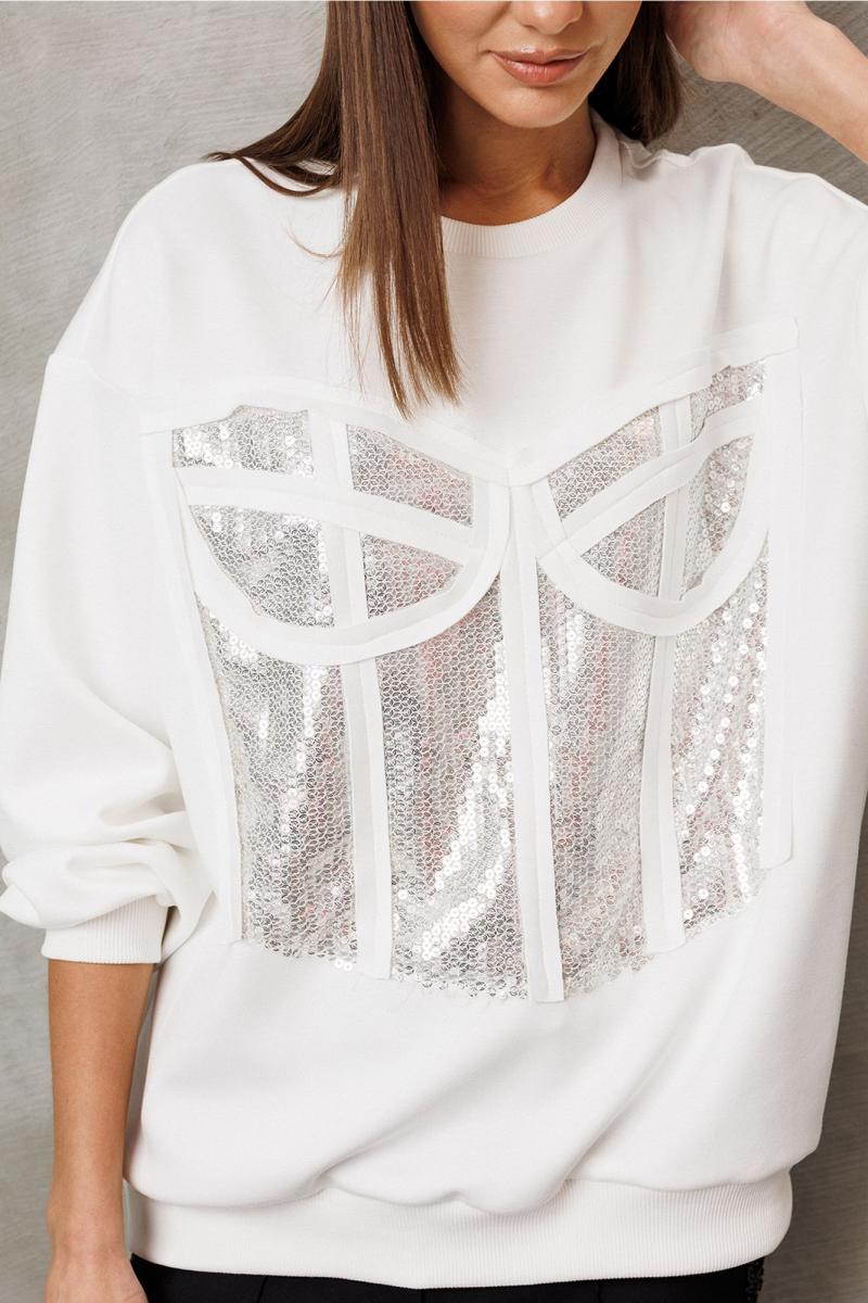 Джемпер из технологичного трикотажного полотна с эффектом peach. Прямого силуэта с втачным рукавом и спущенной линией плеча, с манжетой из отделочной ткани по низу рукава. По переду имитация корсета из пайеток. По горловине и низу изделия притачная планка из отделочной ткани.