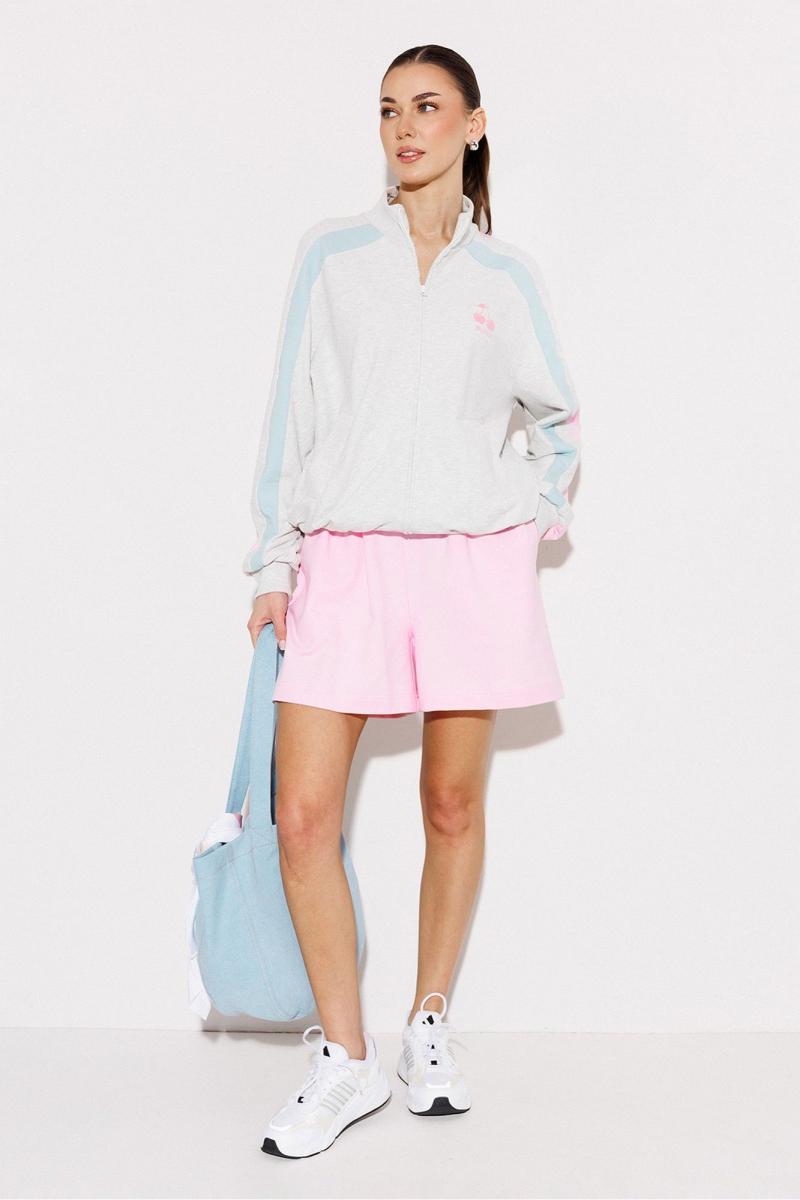 Джемпер мультиколор трикотажный (2-хнитка) прямого силуэта. По полочке рукав-реглан, по спинке-втачной. Рукав с лампасами из ткани другого цвета с манжетой по низу рукава. Полочка с центральной застежкой на тесьму-молнию, карманом-листочкой и печатью "Cherry". По переду рукав переходит в кокетку. По спинке один из лампасов переходит в кокетку. По горловине воротник-стойка. По низу изделия притачная планка.