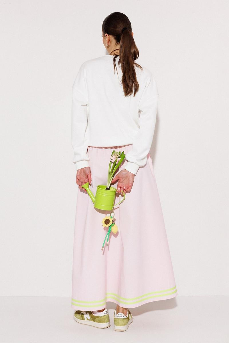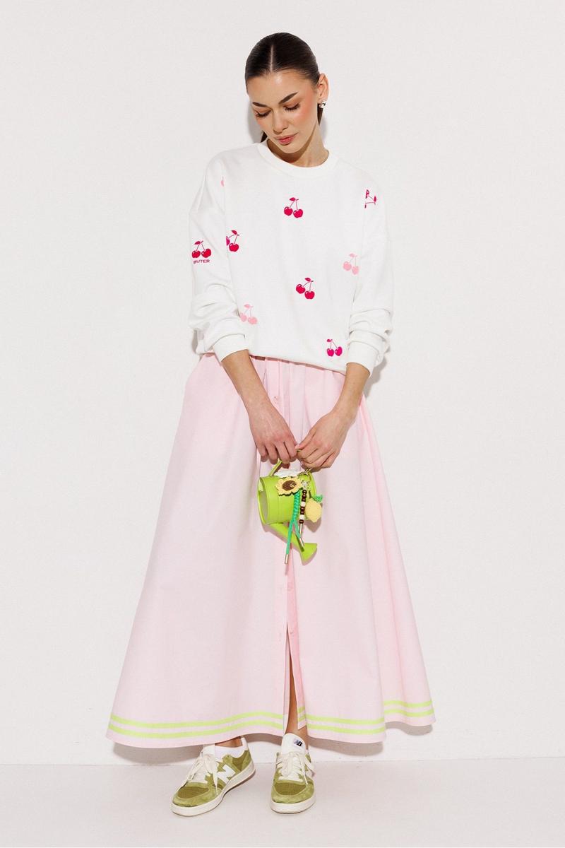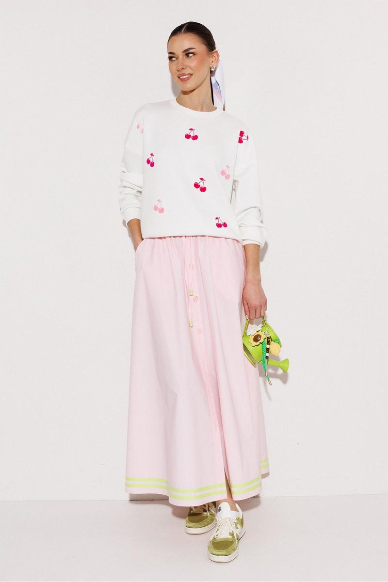 Джемпер из технологичного трикотажного полотна с эффектом peach. Прямого силуэта с втачным рукавом и спущенной линией плеча, с манжетой из отделочной ткани по низу рукава. По переду и на рукаве печать "CHERRY". По горловине и низу изделия притачная планка из отделочной ткани.