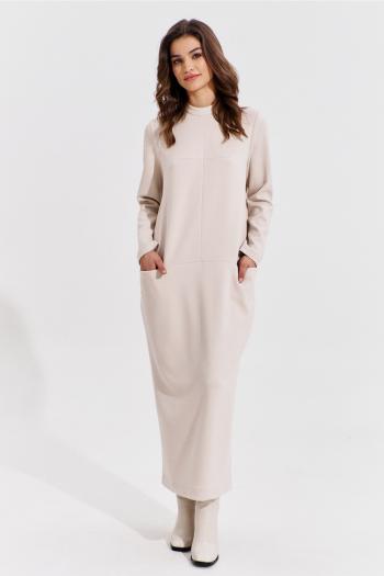 Джемпер из вывязанных деталей, комбинированной вязки, прямого силуэта, «оверсайз», длиной до линии бёдер, со спущенной линией плеча, с рукавами, длиной до запястья. Горловина округлой формы со стойкой. Низ рукавов и стойка горловины более плотной эластичной вязки столбиком, для лучшего прилегания к телу.