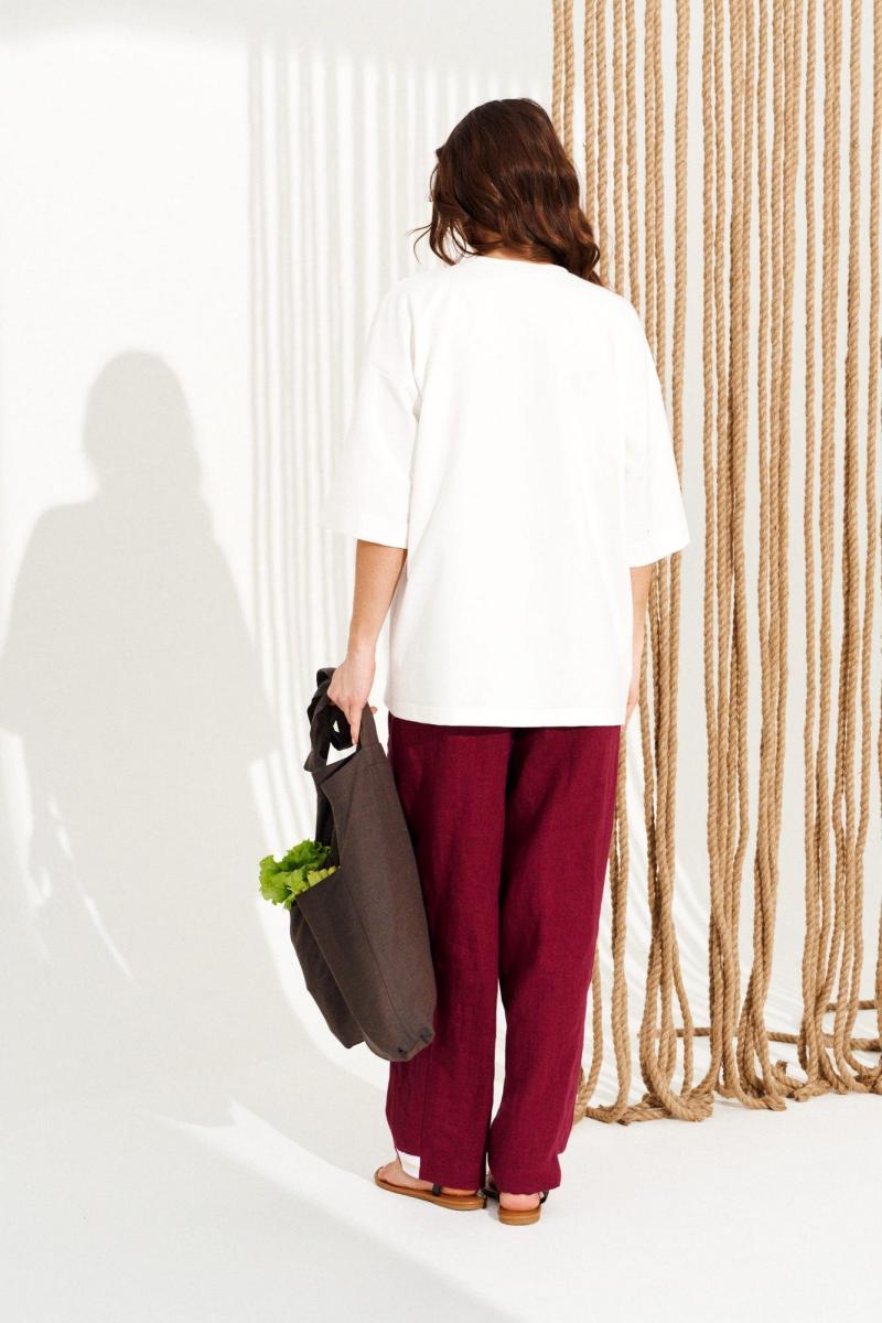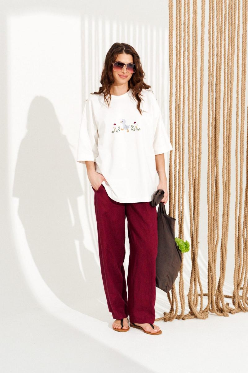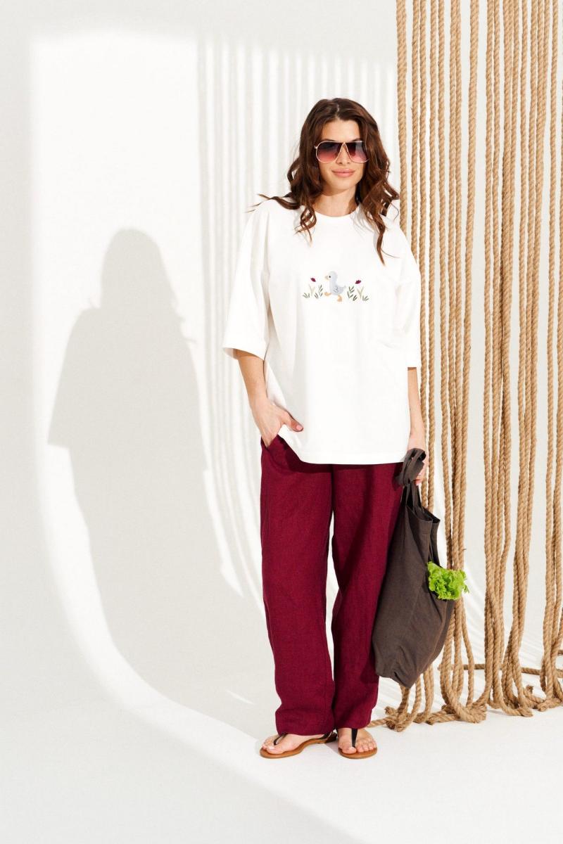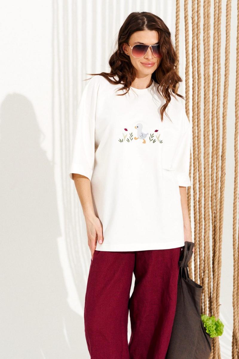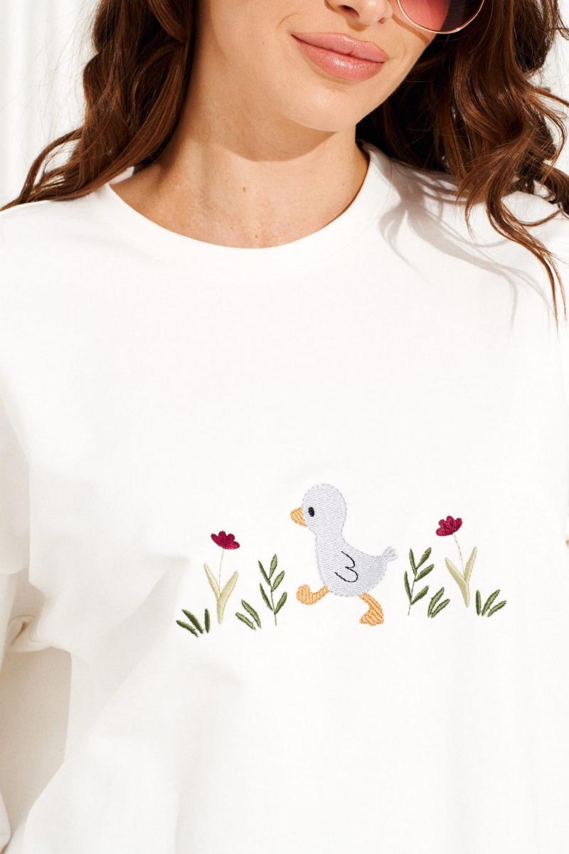 Джемпер из трикотажного полотна свободного объема, прямого силуэта, с круглым вырезом горловины. Вырез горловины обработан притачной обтачкой. Перед и спинка цельные. По переду выполнена вышивка «Утенок». Рукав втачной, одношовный, короткий. Длина изделия на модели вдоль середины спинки — 68,5 см (допустимое отклонение +/- 1 см)