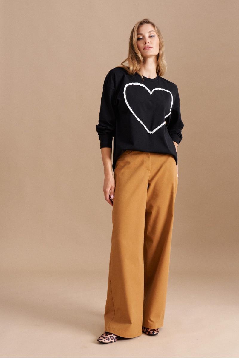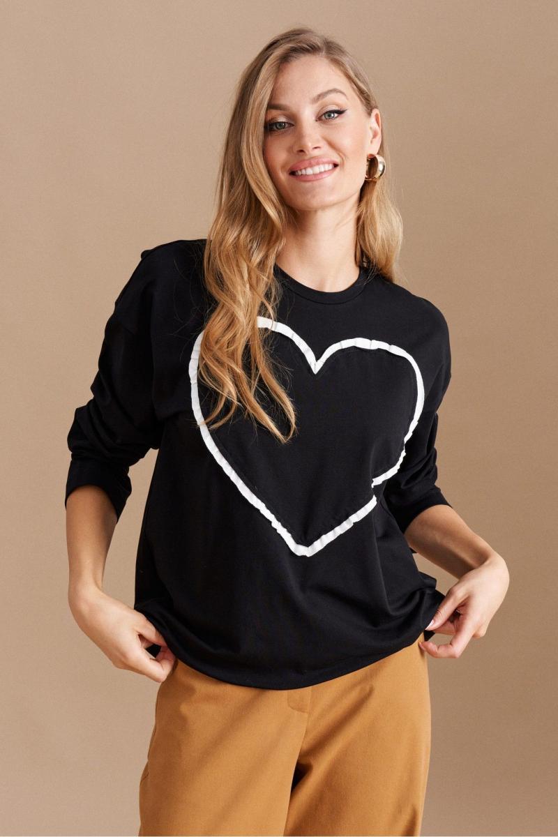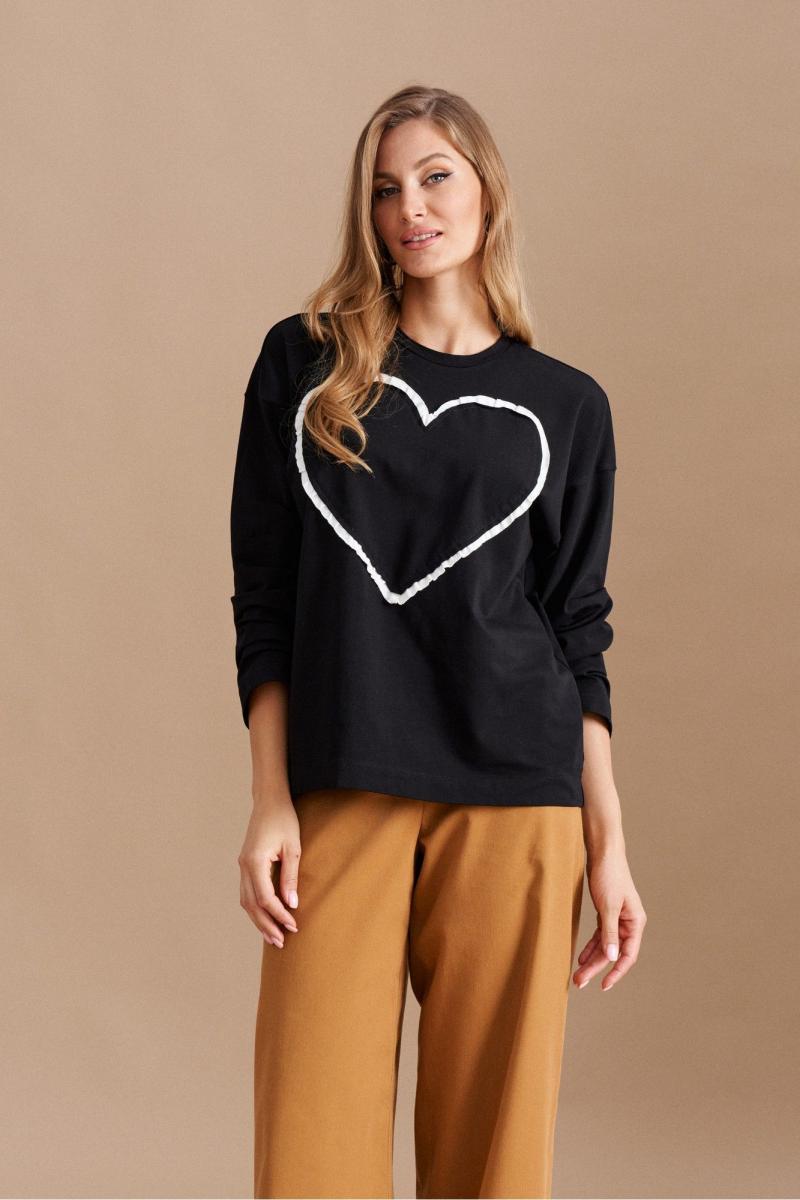 Джемпер женский свободного кроя из трикотажного хлопкового полотна. Изделие с длинным втачным рукавом. По переду декоративные элементы в виде дизайнерской аппликации. Длина изделия до линии бедер.