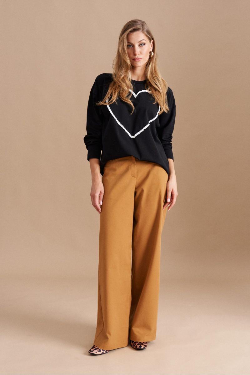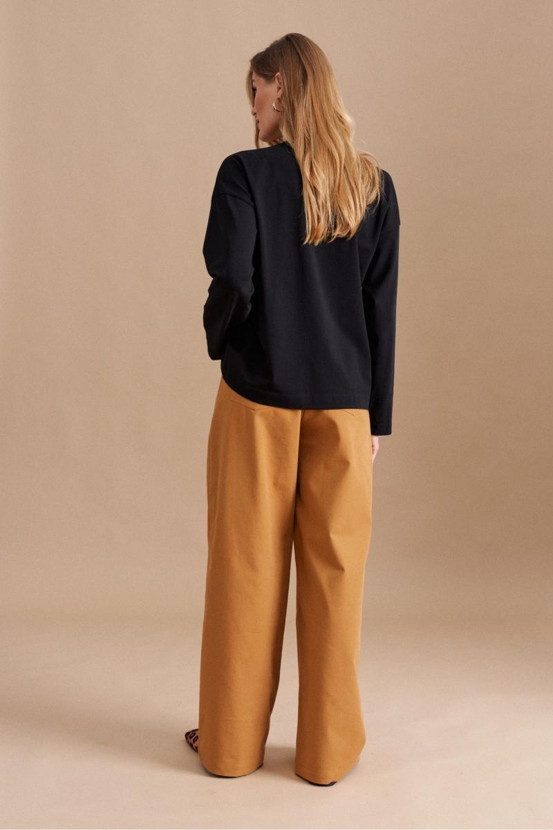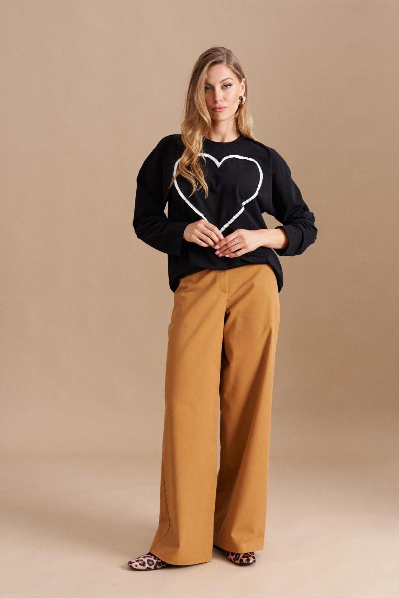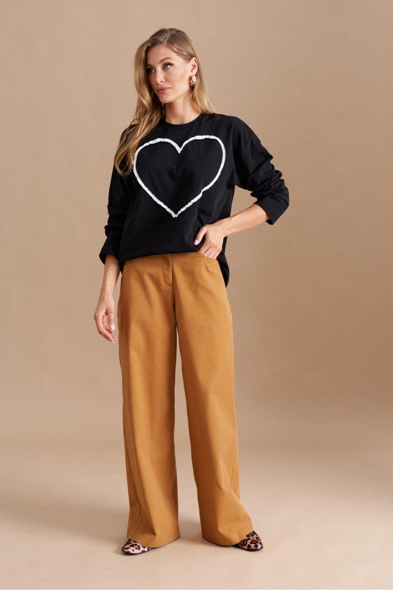 Джемпер женский свободного кроя из трикотажного хлопкового полотна. Изделие с длинным втачным рукавом. По переду декоративные элементы в виде дизайнерской аппликации. Длина изделия до линии бедер.