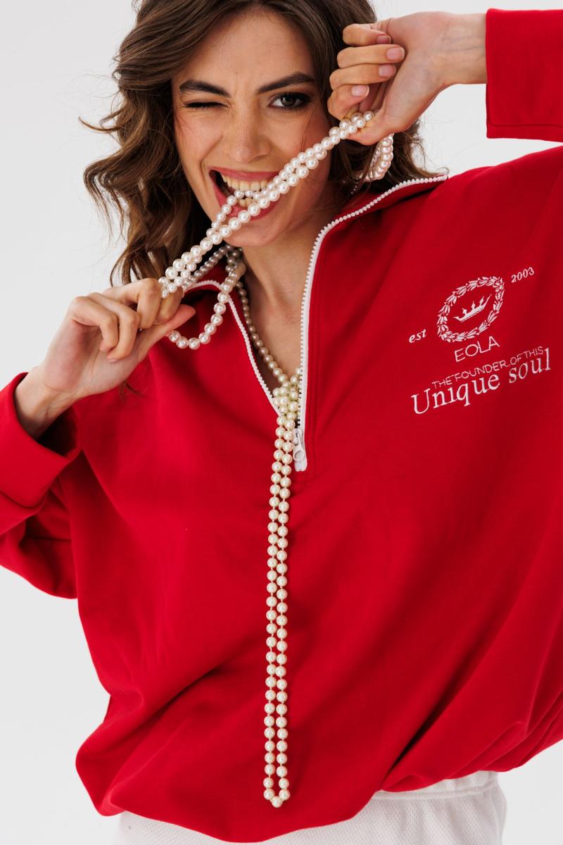 Джемпер выполнен из трикотажного полотна. Джемпер прямого силуэта, длиной до линии бедер. Спереди застежка на молнию. Горловина округлой формы, обработана воротником-стойкой. Плечевой шов удлинен. Рукав рубашечного кроя, одношовный. Низ рукава на паритачной манжете из основной ткани. По низу джемпера регулируемая эластичная тесьма. Джемпер декорирован вышивкой по переду.
