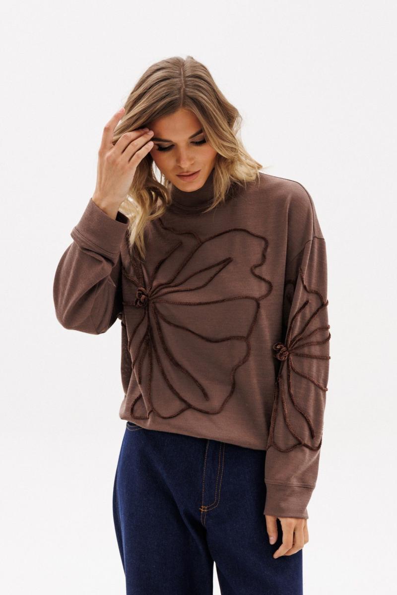 Джемпер выполнен из трикотажного полотна. Джемпер О-образного силуэта, длиной до линии бедер. Перед и спинка цельные. Горловина округлой формы с воротником-стойкой. Плечевой шов удлинен. Рукав рубашечного покроя, одношовный. Низ рукава на притачной манжете из основной ткани. Джемпер декорирован вышивкойпо переду и левому рукаву.