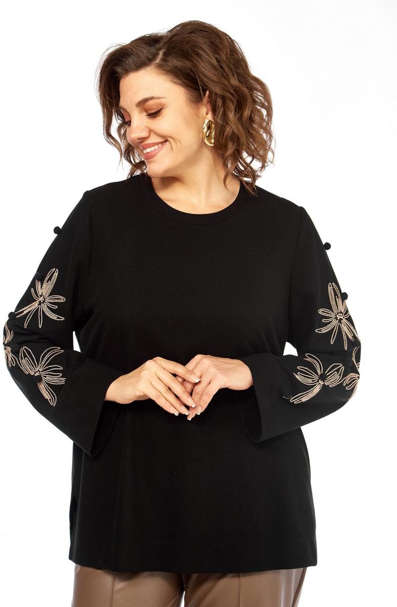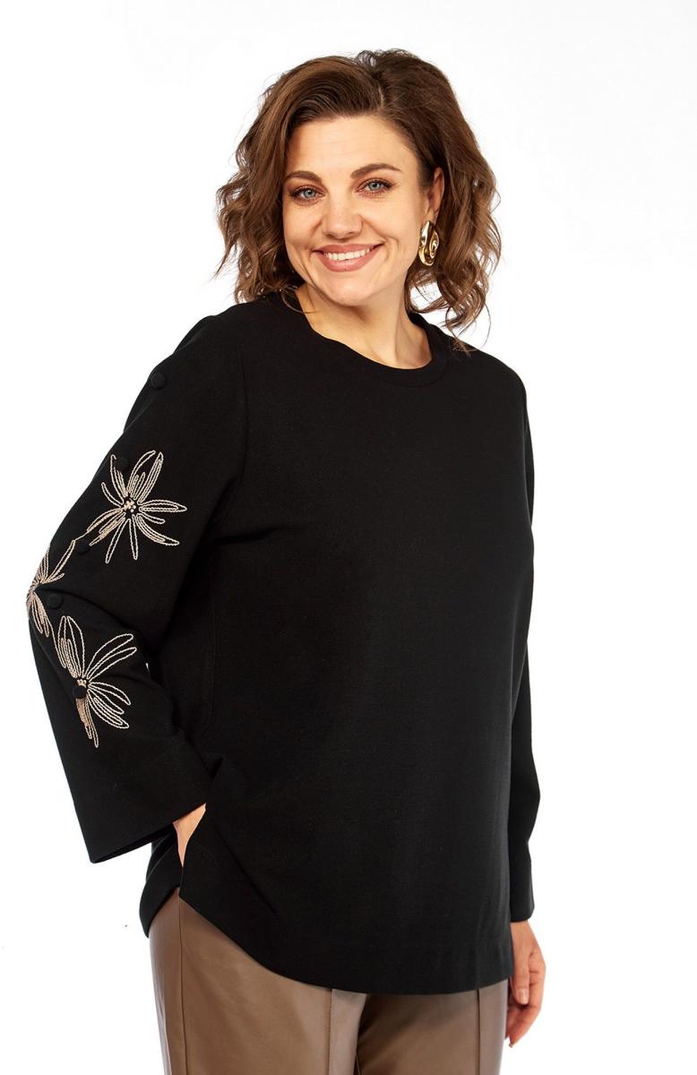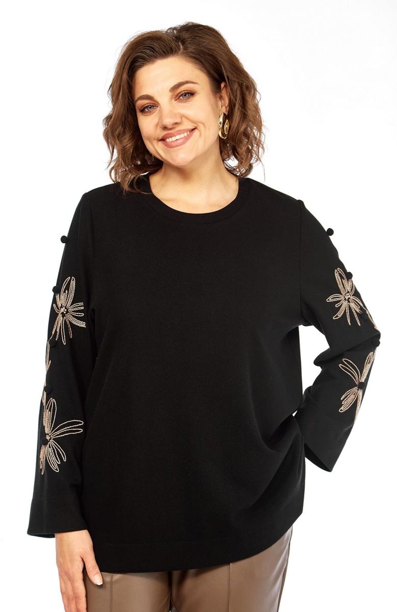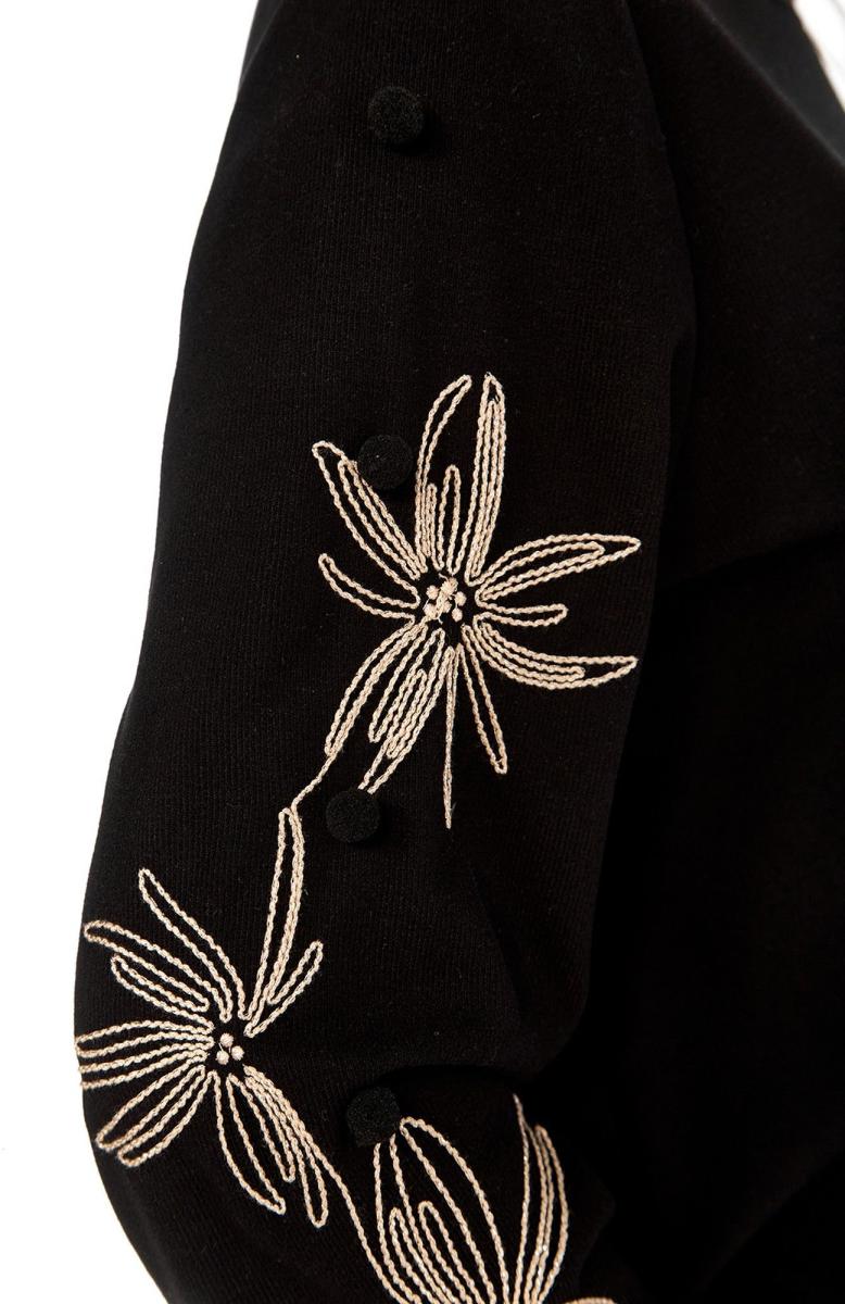 Джемпер женский, выполнен из трикотажного полотна. Перед и спинка цельнокроеные. Горловина круглой формы. Рукава втачные, декорированны вышивками и помпонами. Длина джемпера по спинке — 69 см, длина плеча — 10 см, длина рукава — 62 см. р.52 — ПОГ 56 см ПОБ 60 см, р.54 — ПОГ 58 см ПОБ 62 см, р.56 — ПОГ 60 см ПОБ 64 см.