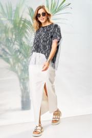 Джемпер двухслойный, свободного силуэта, с втачными рукавами.Нижний из хлопкового трикотажа,верхний-из сетки средней жесткости с легкой эластичностью с дизайнерским принтом. На нижней детали переда джемпера по центру нанесена декоративная печать, вырез горловины округлой формы с втачной бейкой.Рукава втачные одношовные, короткие.