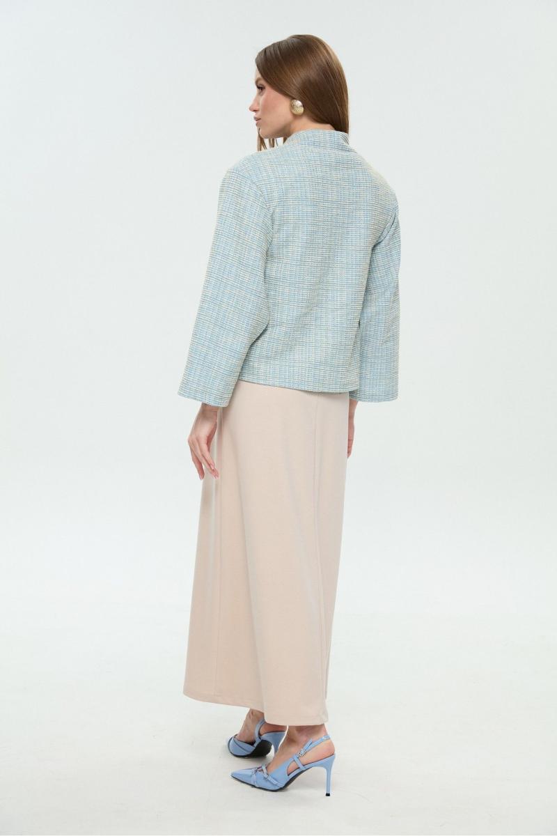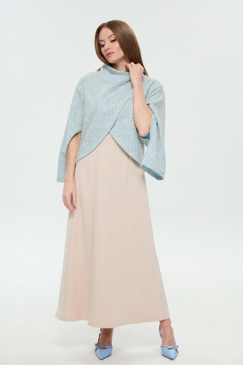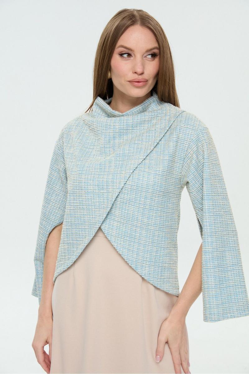 Укороченный джемпер-кейп с округлой горловиной и фигурным лифом. Рукав втачной широкий , от линии локтя до запястья есть дополнительное отверстие для рук.