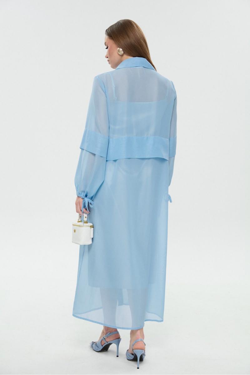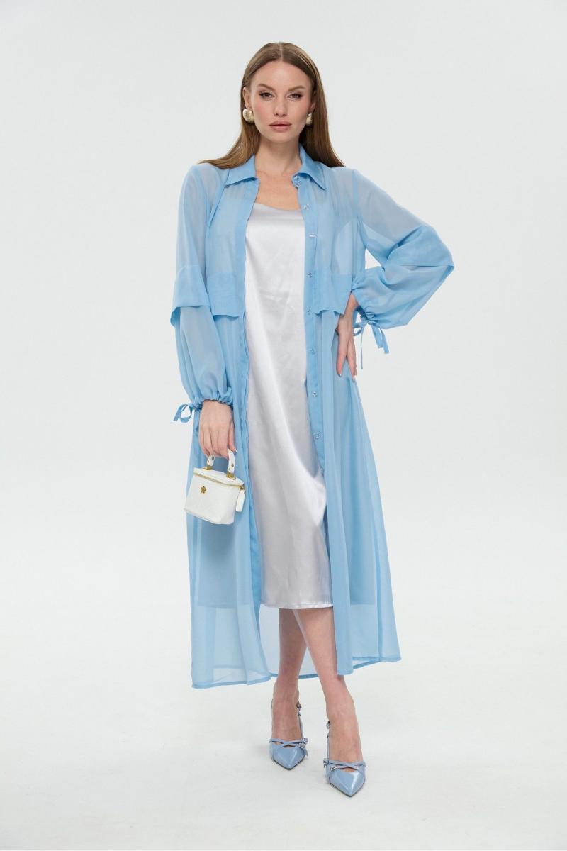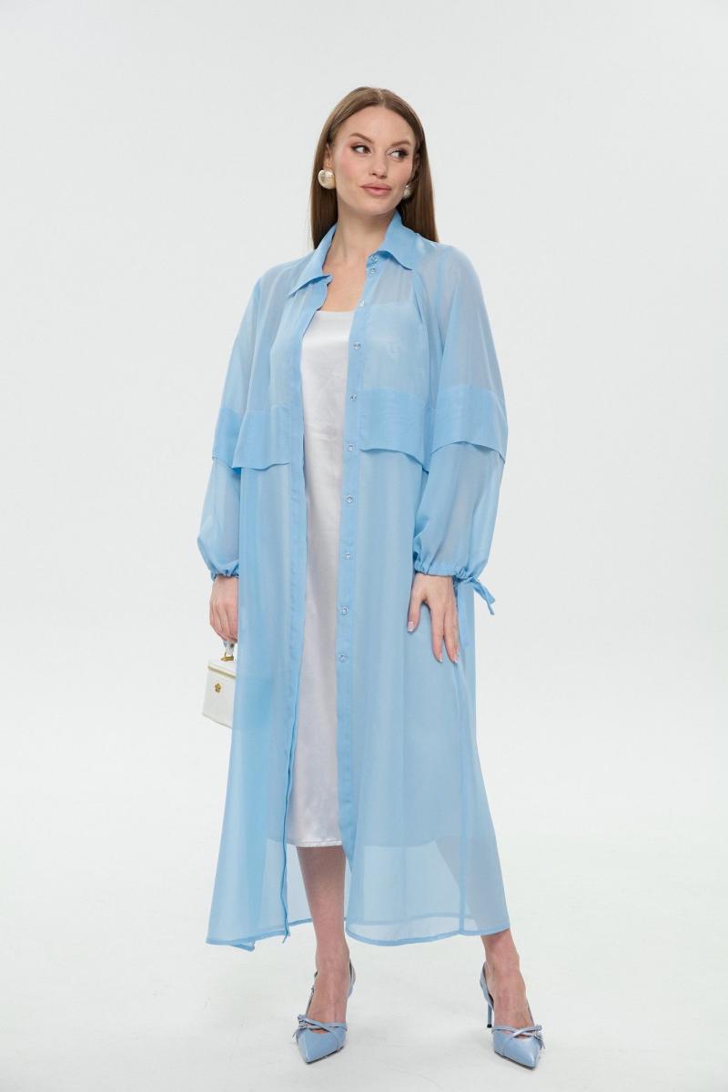 Платье-кардиган из шифона с центральной отрезной застёжкой на потайную планку на петли и пуговицы.По переду и спинке цельнокроеные складки на уровне талии. Рукав втачной,одношовный рубашечноно типа. По низу рукава пробиты петли и вставлена завязка для фиксации сборки . Воротник рубашечный стояче отложной.