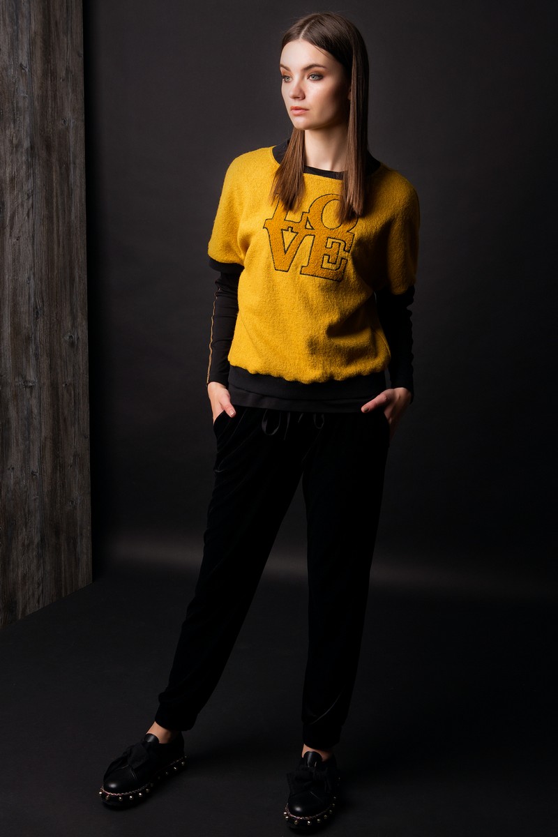 Молодежный свитшот из полушерстяного трикотажа прямого силуэта с планками из довяза по горловине, рукаву и низу изделия, с объемной вышивкой по переду.