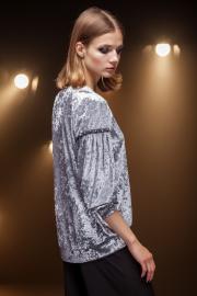 Нарядный джемпер прямого силуэта из мягкого переливающегося велюра. Рукав покроя "реглан" с отрезной деталью и сборкой, декорированный серебристой тесьмой с люрексом, внизу на манжете. Низ джемпера фигурный, с прогибом по спинке.