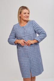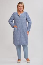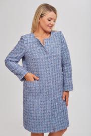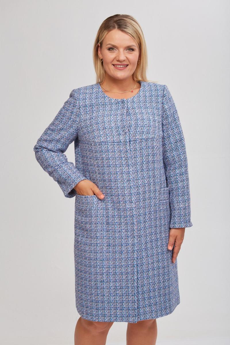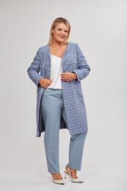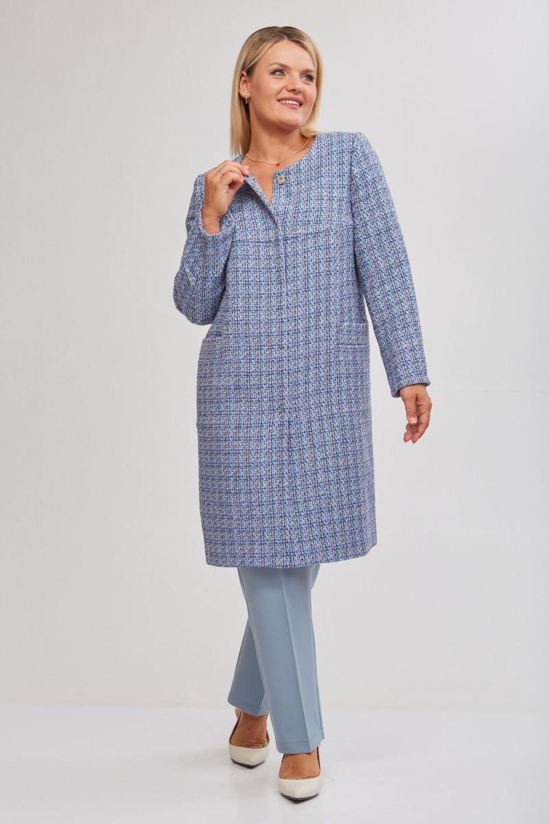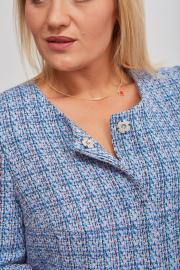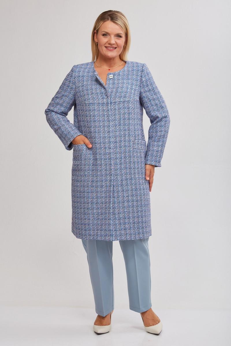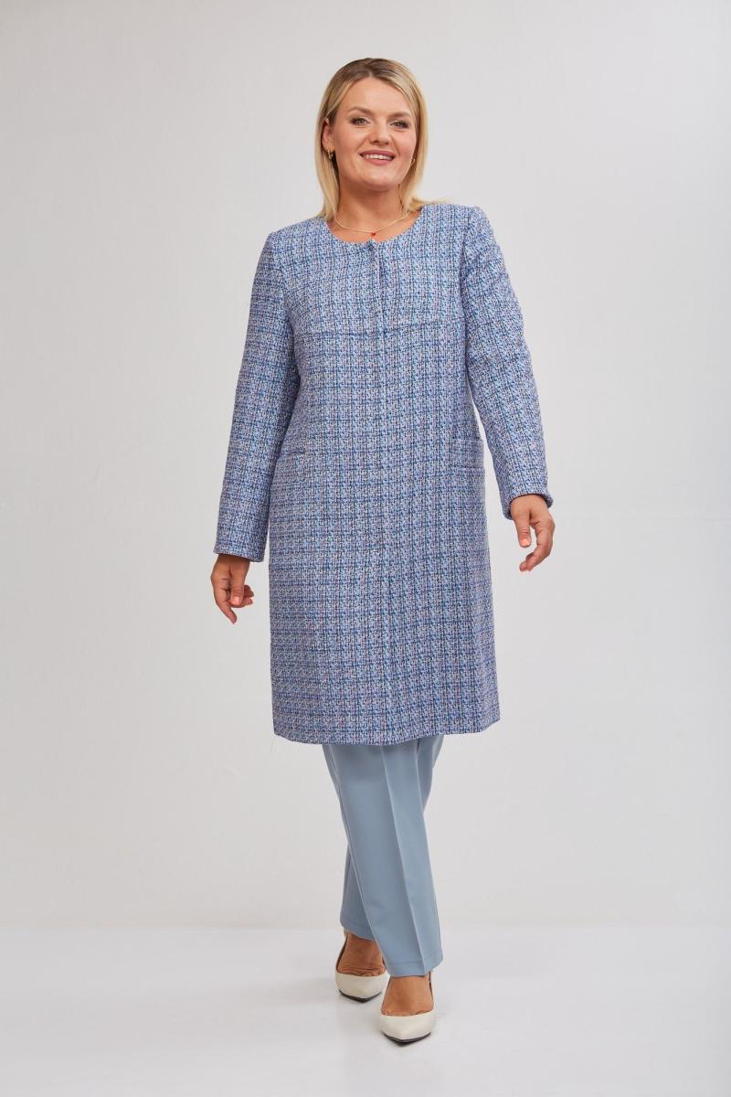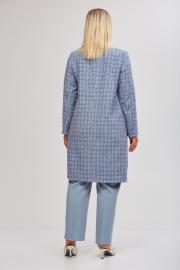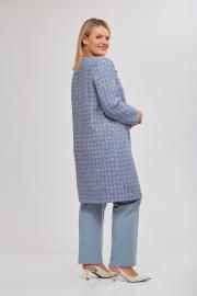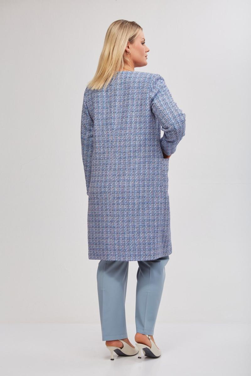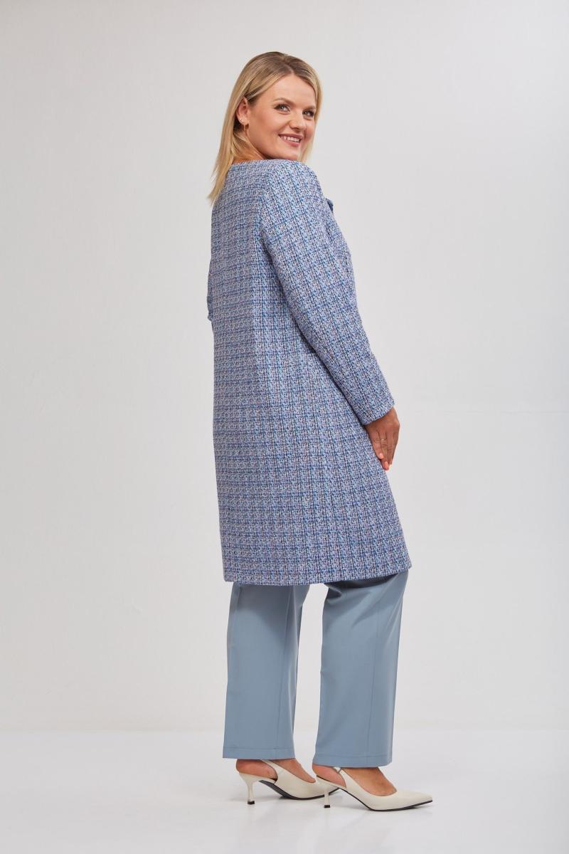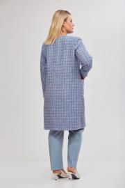 Кардиган из жаккардовой ткани «Шанель» на подкладке, полуприлегающего силуэта, без воротника, с центрально бортовой застежкой на пришивные кнопки. Перед с талиевыми вытачками, карманами с листочкой входящей в подрез бочка и боковой шов . Спинка со средним швом. Рукав втачной двухшовный с широкой обтачкой для отворота. Вырез горловины круглый.Длина по спинке 100. Длина рукава 64.