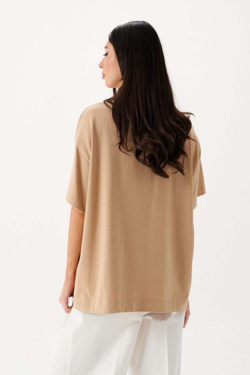Футболка прямого свободного кроя, выполнена из хлопкового полотна бежевого цвета. Характеристики: прямой свободный крой, горловина овальная, рукав слегка спущен, горловина выполнена из довяза. Длина по центру спинки 65 см, длина рукава 18 см.