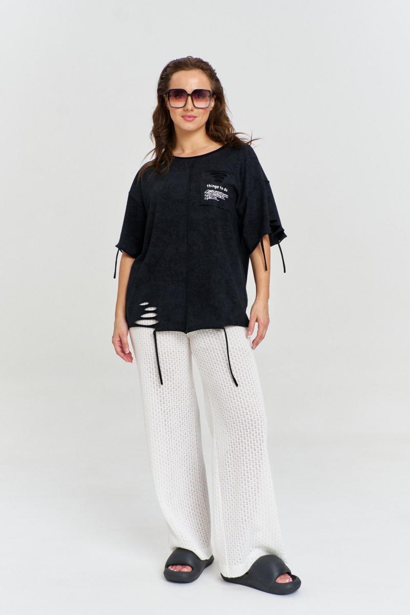 Футболка из хлопковой кулирки с "мраморным" принтом, свободного силуэта, с коротким рукавом и круглой горловиной. Перед и спинка со средними швами налицо. На переде накладной карман. Изделие декорировано авторскими принтами и эффектными прорезями.