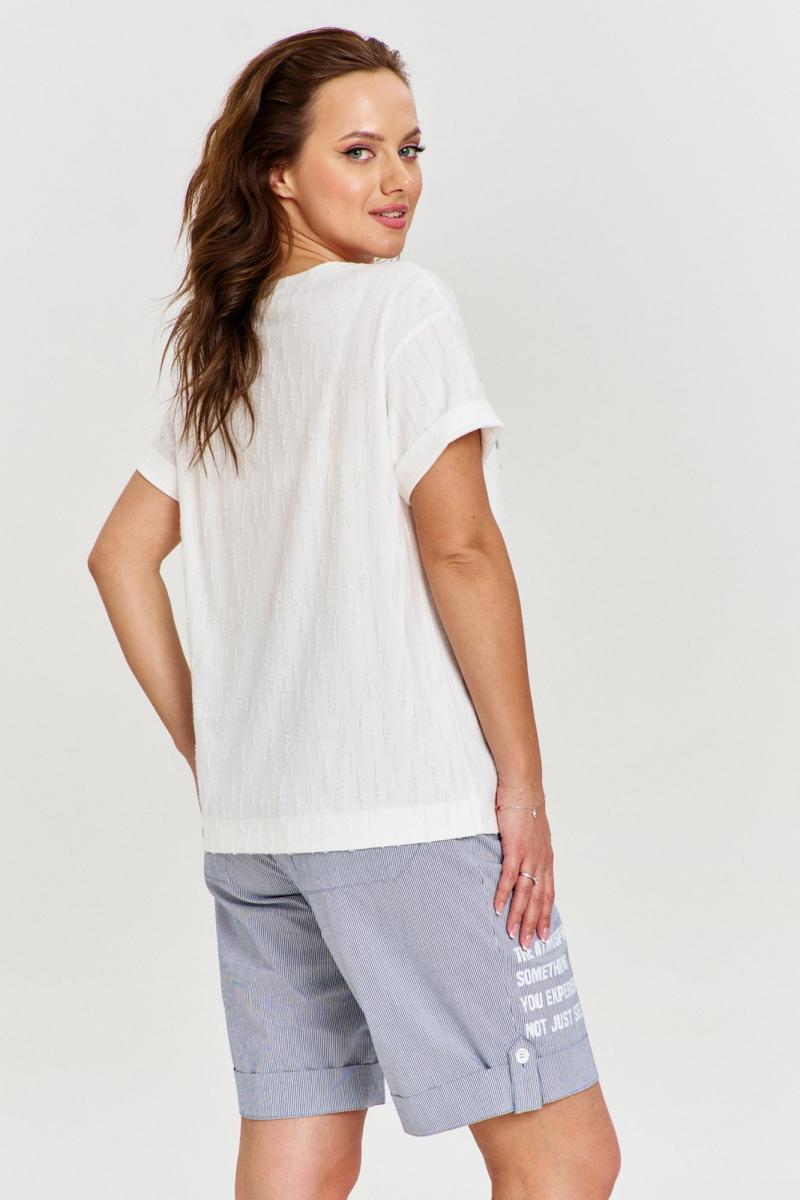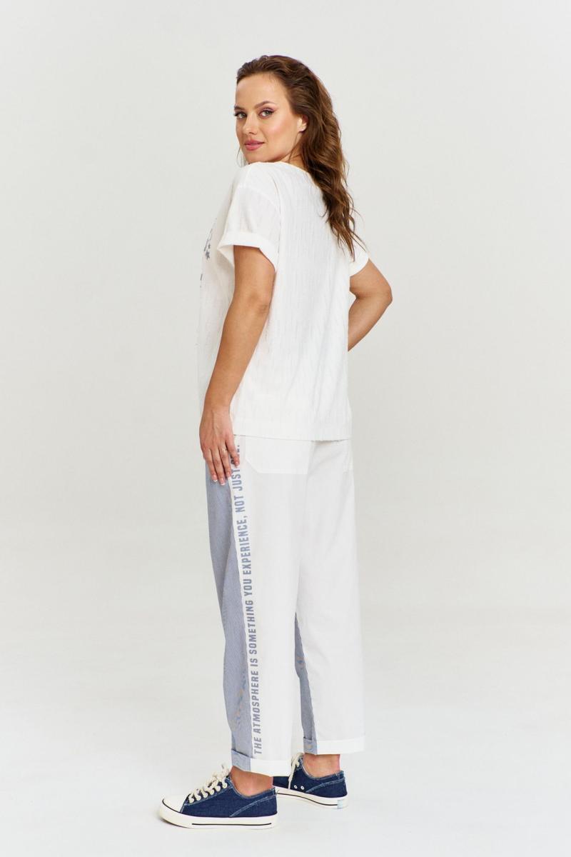 Футболка из вискозного трикотажа с фактурой "дырочки", свободного силуэта с коротким рукавом и круглой горловиной. На переде авторский принт и джинсовая нашивка с необработанным срезом.