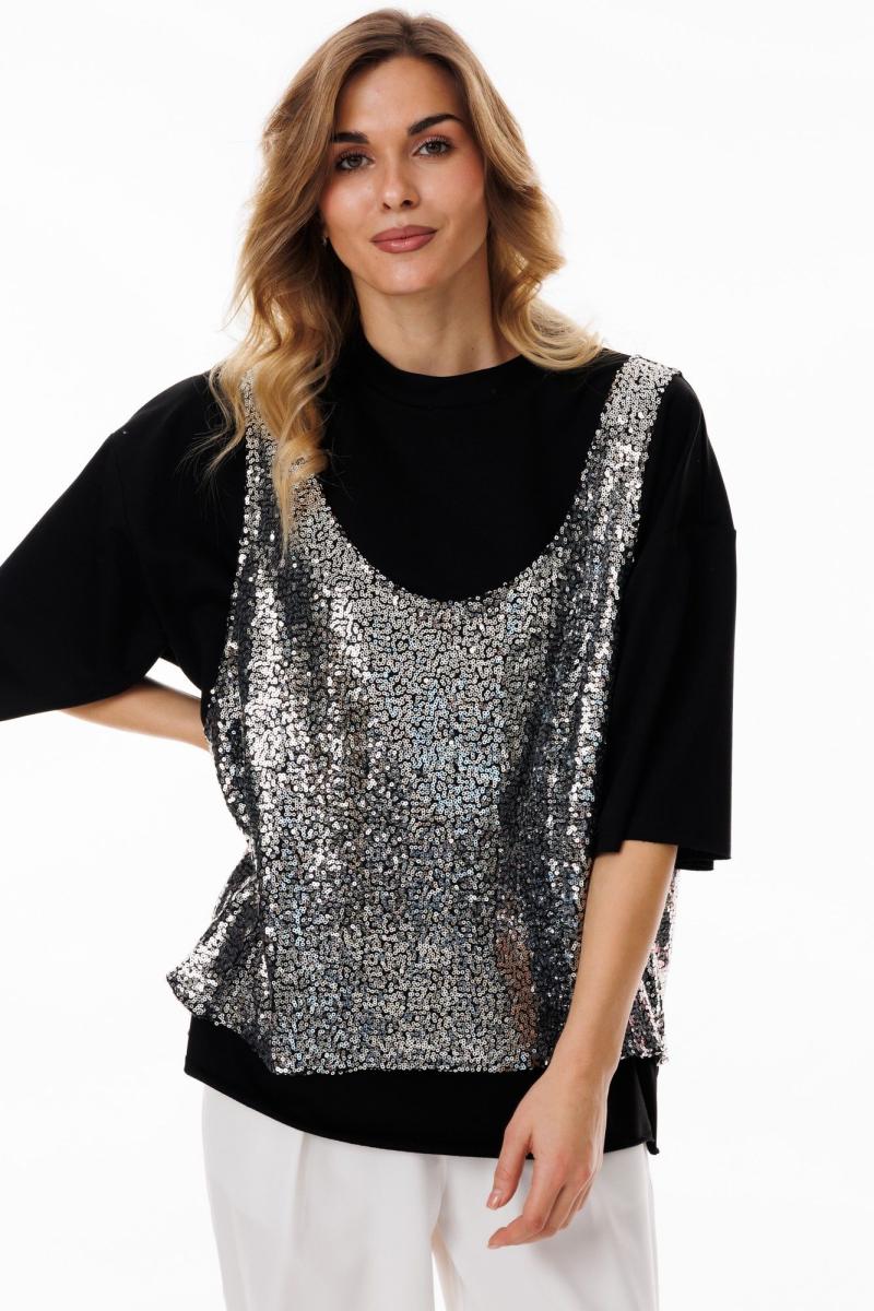 Стильный блузон, состоящий из тандема: футболка+майка металлик в стиле oversize. Блузон свободного силуэта со спущенной линией проймы и укороченным втачным рукавом длиной 26 см. Горловина округлая, оформлена планкой 2,8 см. Длина блузона по спинке 65-68 см (в зависимости от размерного ряда). Низ изделия и рукавов обработаны открытым срезом. Верхние детали изделия отлетные и имитируют силуэт майки без рукавов и состоят из мерцающего трикотажного полотна с пайетками. В плечевых и боковых швах детали верхнего изделия закреплены. Горловина спинки и переда майки имеют округлые глубокие вырезы. Верхние детали майки короче основного изделия на 6-7 см. Длина изделия по спинке 48 см. Особые рекомендации: рекомендуется холодная деликатная ручная стирка, без использования отбеливающих СМС, без интенсивного трения. Сушка в вертикальном положении. ВТО с минимальным паром.