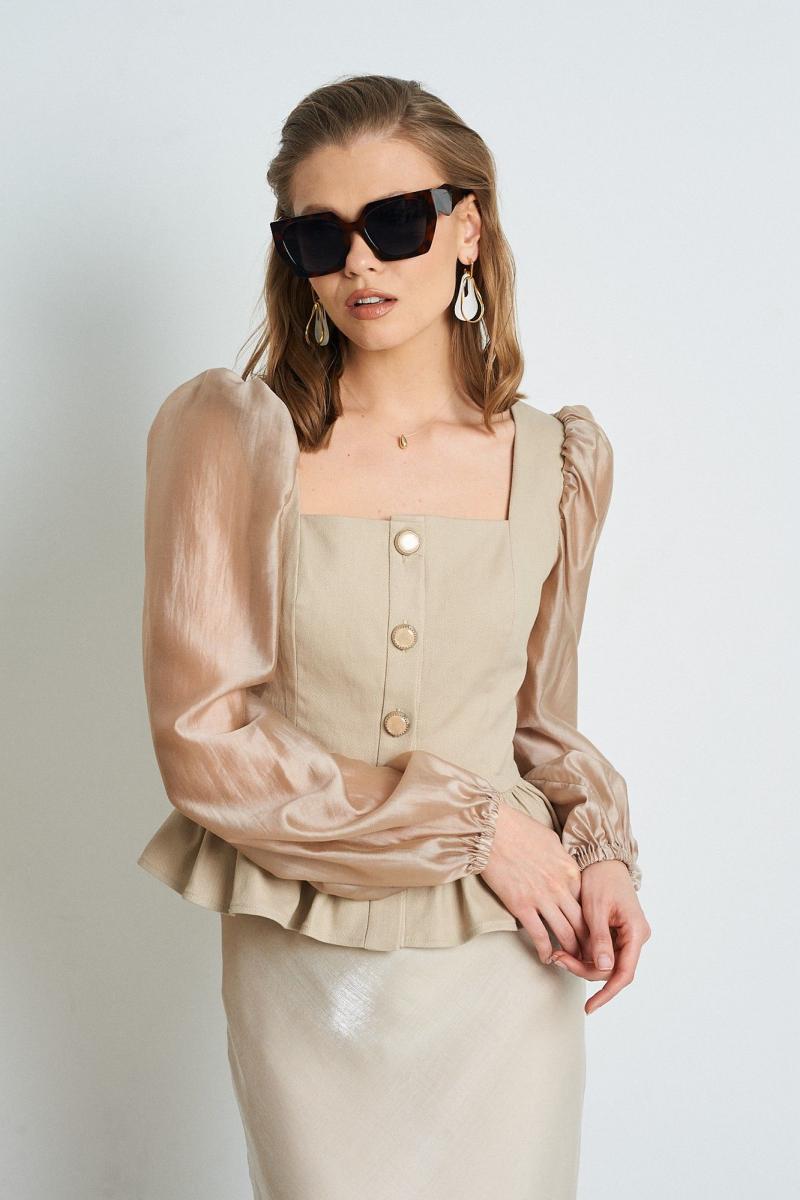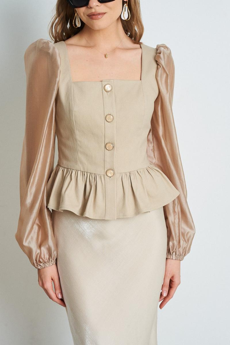 Топ из джинсового полотна. Застежка на пуговицы. Рукава из полупрозрачной ткани в тон. Длина топа 55 см. Состав основной ткани 65% хлопок, 30% ПЭ, 5% спандекс. Состав ткани на рукавах 83% вискоза, 17% ПЭ.