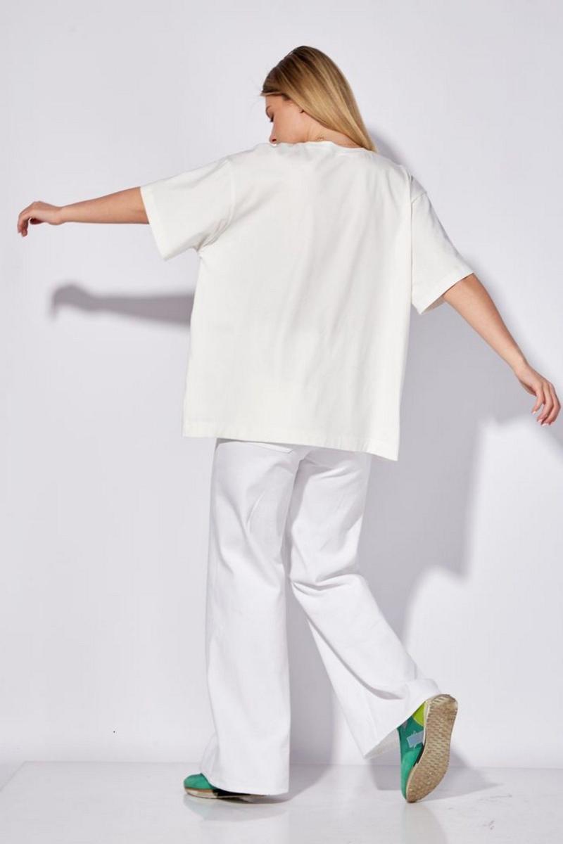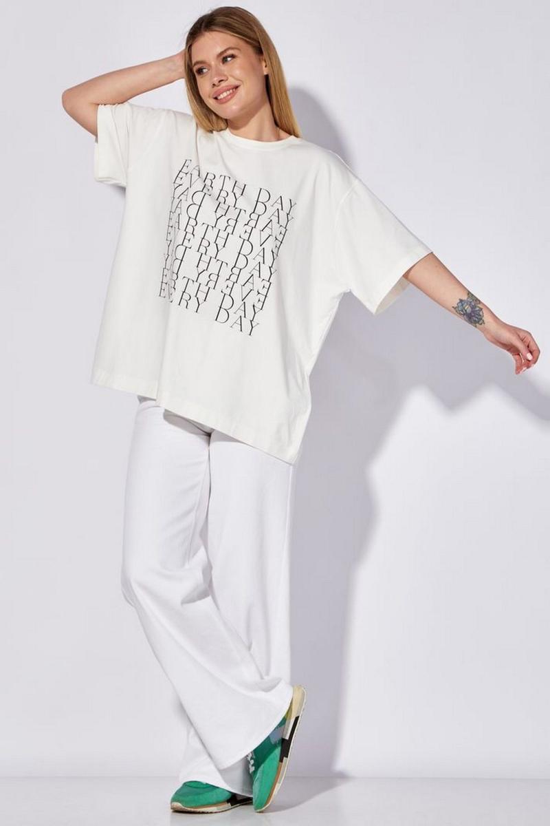 Лаконичная белая женская футболка oversize прямого силуэта со спущенной линией плеча, удлиненный рукав до локтя, круглая форма горловины и слега удлиненный крой. На футболке дизайнерский принт.