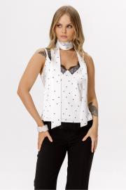 Топ в бельевом стиле в горохи с фигурным лифом и кружевом (приобрести брюки с фото можно по арт. 6557). Детали: полуприлегающий силуэт, лиф с отрезными чашками и кружевными вставками по лифу, V-образный вырез переда, регулируемые бретели, съемный шарфик, подкладка- 100% вискоза