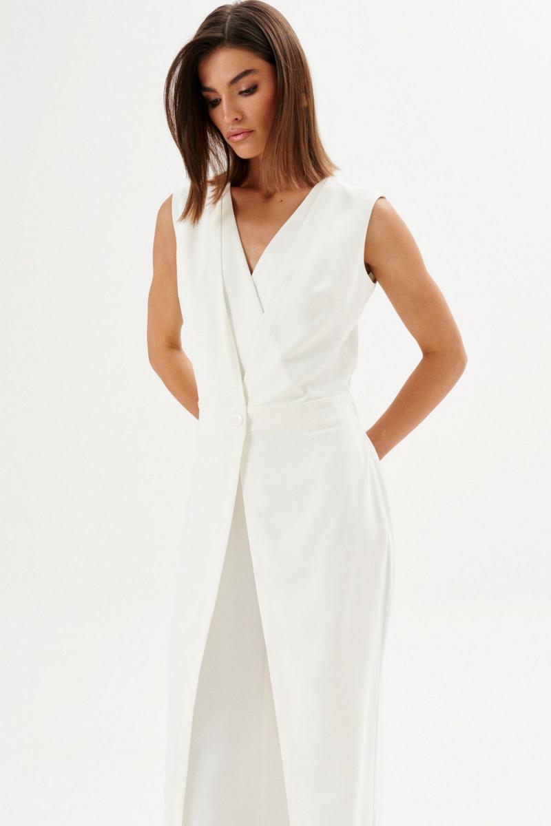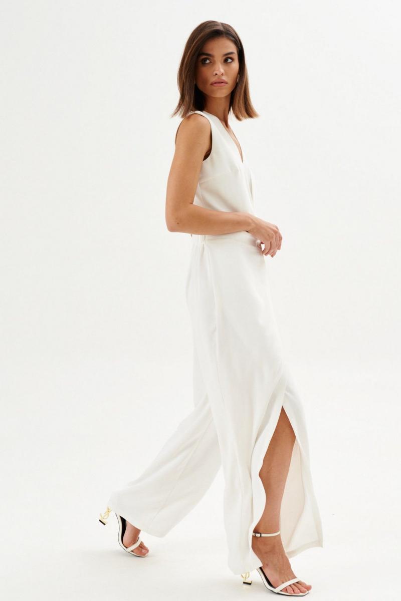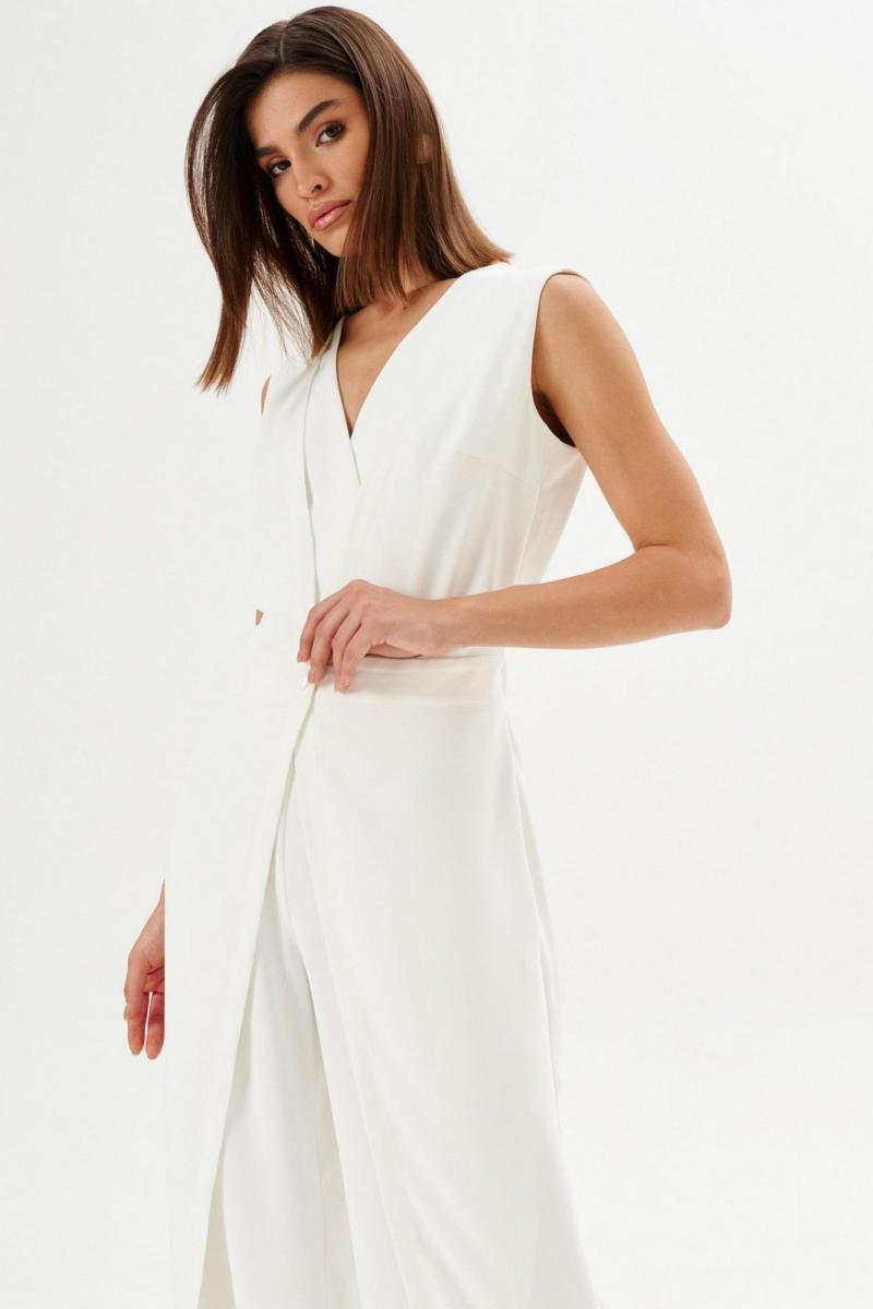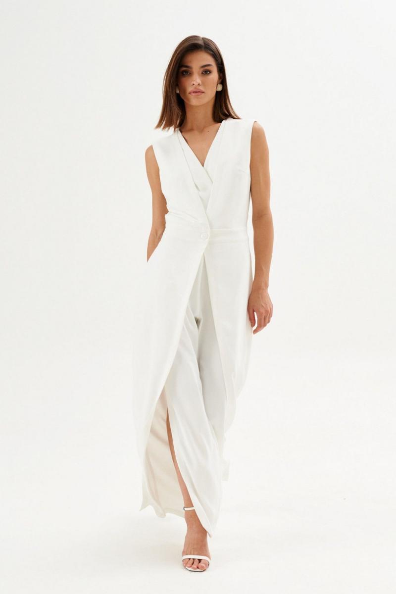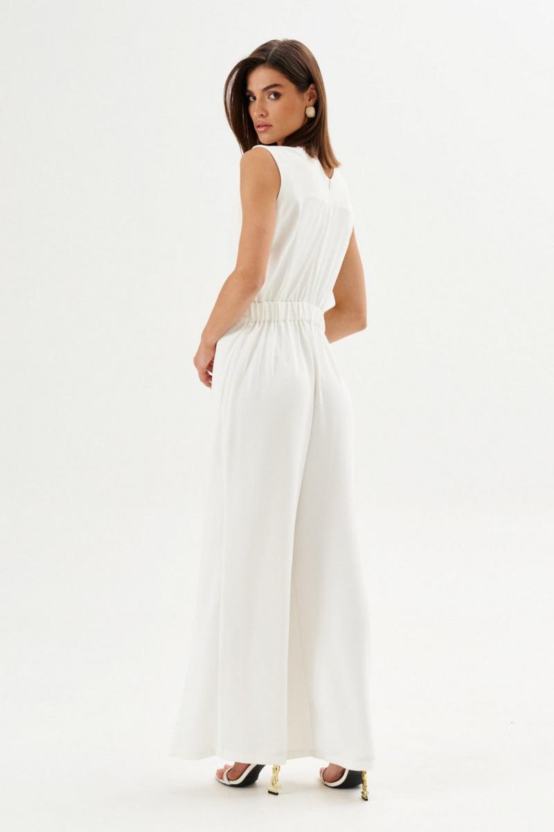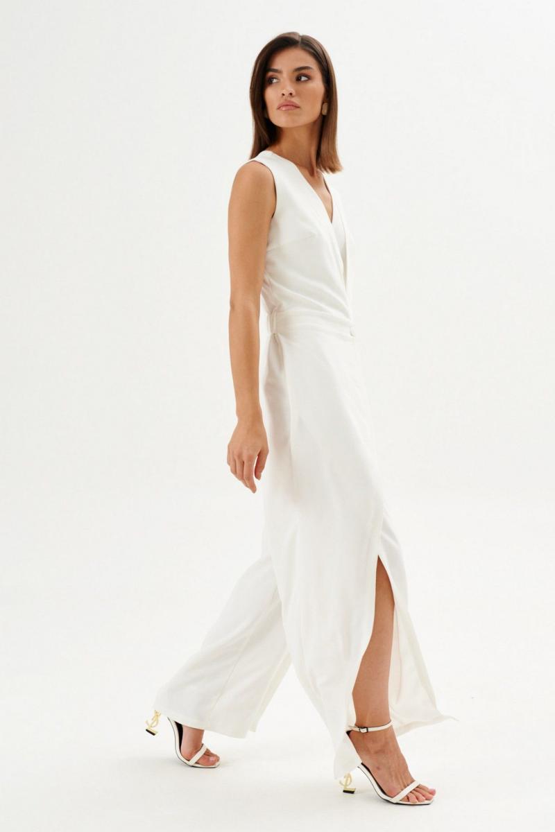 Комбинезон полуприлегающего силуэта: •отрезное по линии талии •лиф на запах с частично вставленной накидкой •спинка с V-образным вырезом и потайной застежкой •брюки с имитацией запаха по переду.