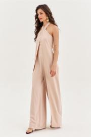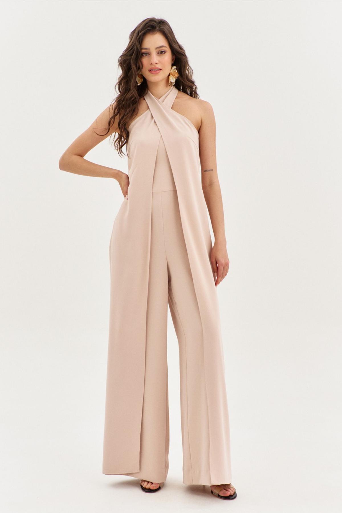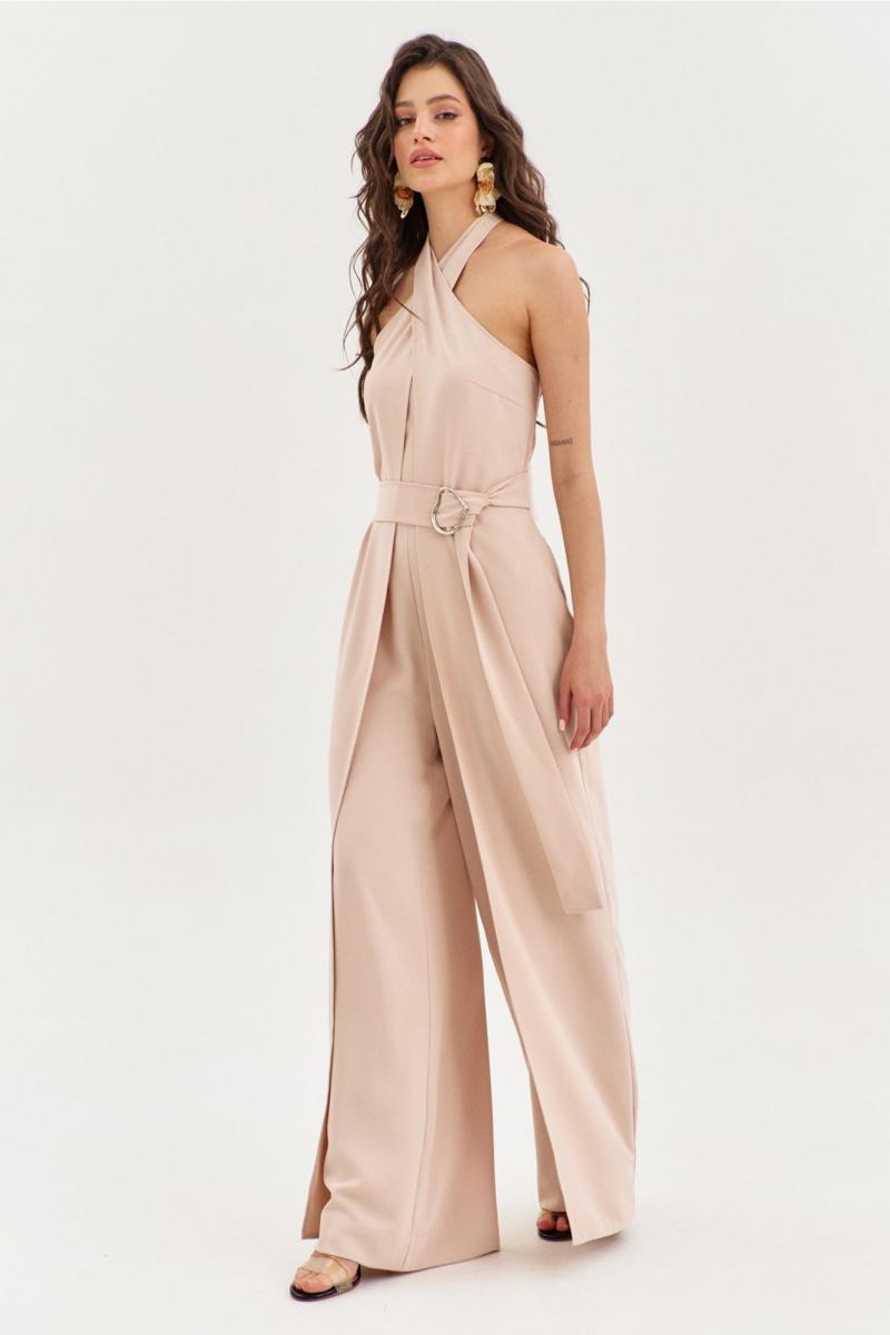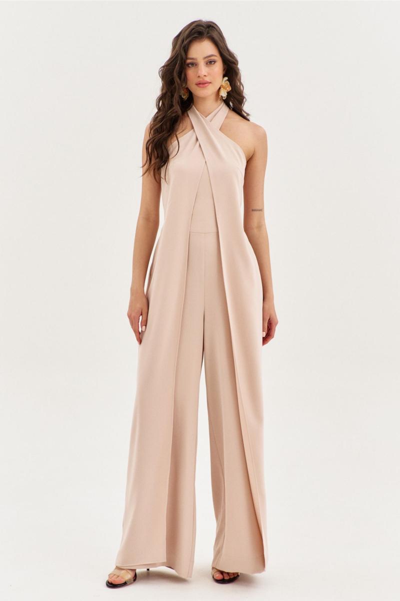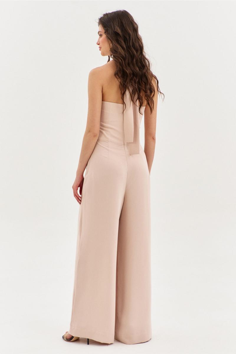 Комбинезон полуприлегающего силуэта. Комбинезон отрезной по линии талии. Лиф переда и спинки с рельефами. В среднем шве спинки вставлена потайная тесьма-«молния». Брюки длинные, широкие. По задним половинам брюк талиевые вытачки. По передним половинам односторонние складки. В боковые швы вставлены отлетные детали, которые переходят в завязки вокруг шей.