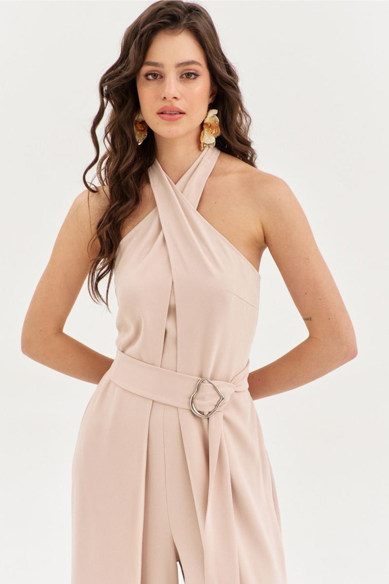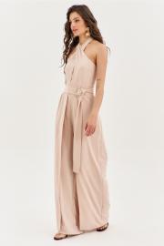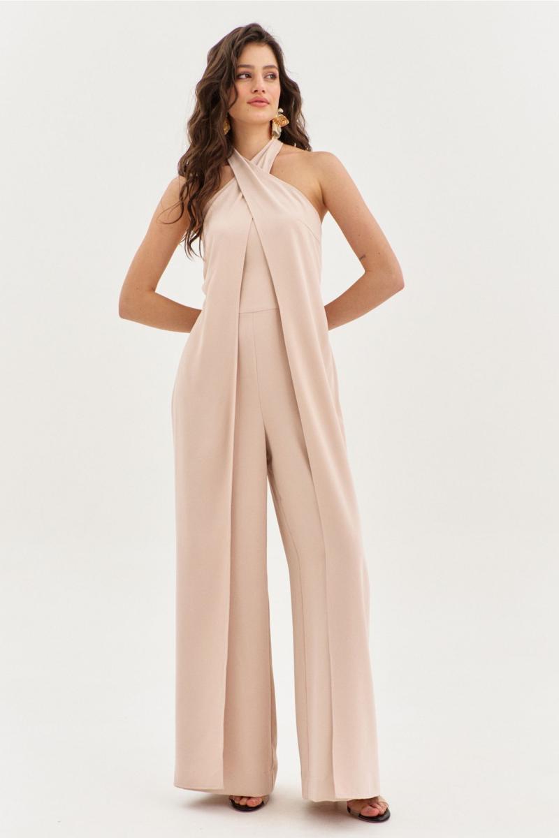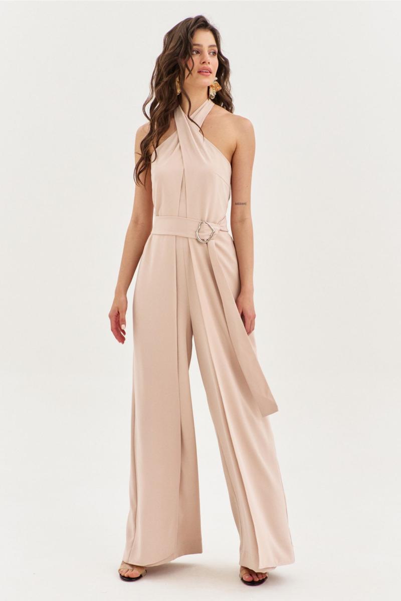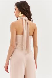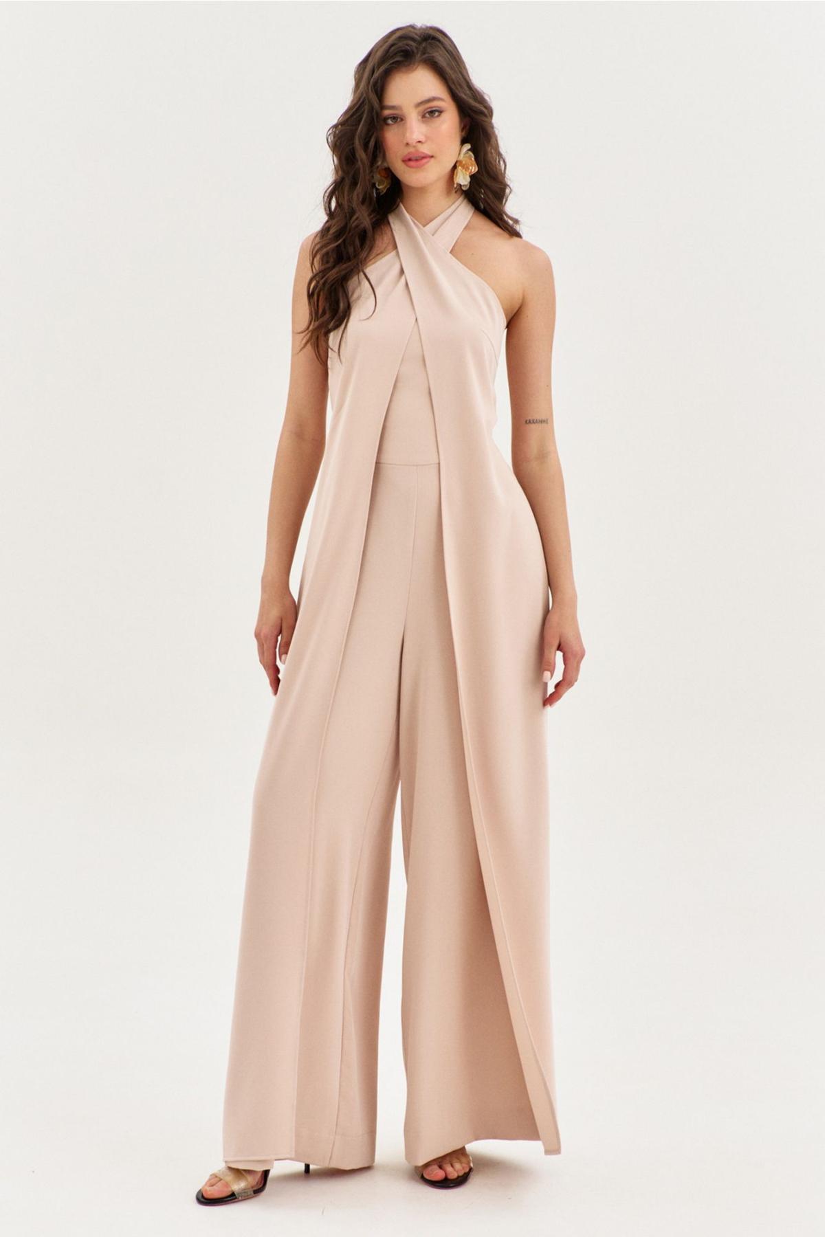 Комбинезон полуприлегающего силуэта. Комбинезон отрезной по линии талии. Лиф переда и спинки с рельефами. В среднем шве спинки вставлена потайная тесьма-«молния». Брюки длинные, широкие. По задним половинам брюк талиевые вытачки. По передним половинам односторонние складки. В боковые швы вставлены отлетные детали, которые переходят в завязки вокруг шей.