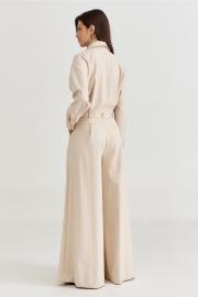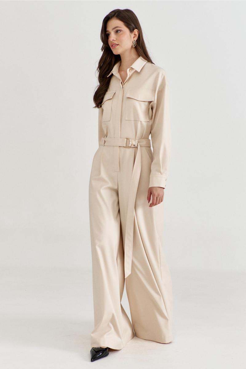 Комбинезон женский, полуприлегающего силуэта, с притачным поясом по талии. Лиф спинки с талиевыми складками, лиф переда со складками от пояса, с настроченными накладными карманами и клапаном. По лифу потайная застежка с притачной планкой. Брюки широкие с мягкими складками по талии, в боковых обработаны карманы. Линия плеча спущена, рукава длинные, по низу со складками, разрезом и притачной манжетой. По горловине воротник рубашечного типа на стойке. По талии втянут съемный пояс с полукольцами.
