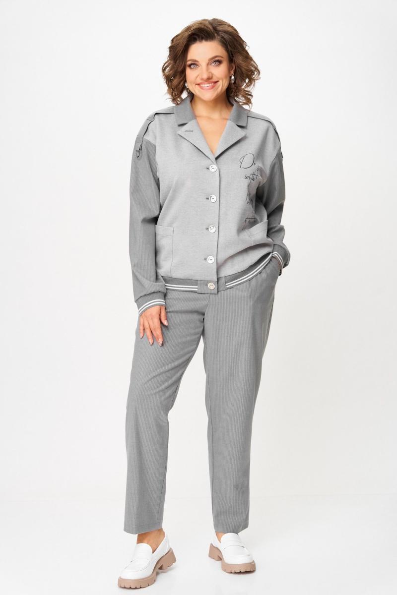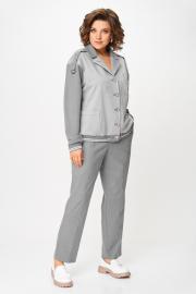 Костюм в стиле спорт-шик сочетающий в себе женственность и комфорт. Сочетание двух тканей трикотажного полотна и костюмной ткани добавляет оригинальность. Жакет со спущеным плечем и декорирован печатью по левой части переда, воротник пиджачного типа. По пинии плеча паты с полукольцом. Рукав втачной одношовный с манжетой по низу. Спинка с кокеткой и отлетной планкой. Понизу довяз и регулируемая кулиса. Брюки, слегка зауженные к низу, свободного силуэта. По переду вблизи боковых швов карманы. Для максимально комфортной посадки по поясу вставлена эластичная резинка.