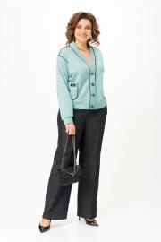 Костюм выделяется нежным оттенком кардигана, который контрастирует с джинсами графитового цвета брюк, создавая баланс между мягкостью и строгостью. Дизайн вдохновлен минималистичным стилем с акцентом на контрастные швы и аккуратные детали, такие как нашивка и пуговицы. Кардиган свободного кроя с глубоким V-образным вырезом и застежкой на крупные декоративные пуговицы. Контрастная отделка кантом по краям и по швам. Два накладные кармана спереди и контрастная нашивка на кармане для акцента придают образу лёгкости и расслабленности. Длинные рукава с эластичными манжетами обеспечивают удобную посадку.Рукав на спущенной плойме. Брюки прямого покроя с боковыми карманами вблизи боковых швов, подчёркивают лёгкость и свободу движения. Для максимально комфортной посадки по поясу вставлена эластичная резинка по спинке и бокам. Тонкая прострочка в цвет превращают костюм в стильный акцент гардероба, который будет уместен как в деловой среде, так и в повседневной жизни.