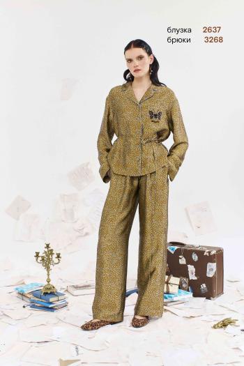 Комплект женский 3-х предметный состоит из жакета, топа и брюк. Жакет женский прямого силуэта, перед на подкладке, с застёжкой на пробивную петлю и пуговицу. Перед с отложными лацканами, с прорезными карманами с листочкой с втачными канцами с наклонным входом. Спинка со средним швом. Рукава втачные, двухшовные, длиной ¾. Воротник отложной с отворотом. Топ женский полуприлегающего силуэта, на узких бретелях с фиксируемой длиной. Перед с нагрудными выточками. Спинка со средним швом. Брюки женские длиной 7/8, на притачном поясе. Застежка на тесьму-молнию типа «гульфик» и по краю пояса на петлю и пуговицу. Передние части с мягкой складкой от пояса. Задние части с талевыми выточками