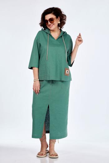 Жакет женский прямого силуэта, с застёжкой на петли и пуговицы.Перед с нагрудными выточками и накладными нагрудными карманами с клапанами пристёгивающиеся на петлю и пуговицу.Рукава одношовные, короткие, понизу с притачными отложными манжетами. Воротник стояще отложной на отрезной стойке.Брюки женские полуприлегающего силуэта по талии и бедрам и прямые книзу, на притачном поясе и шлёвками, с застёжкой типа «гульфик» на тесьму-молнию и петлю, пуговицу по поясу. По боковым на уровне линии колена накладные карманы с клапаном. Понизу ширина фиксируется резинкой и фиксатором продёргивающая в подгибку через пробивную петлю. Передние части с накладными боковыми карманами.