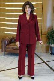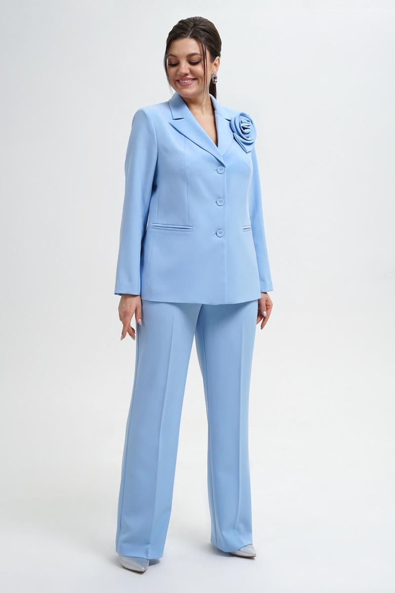 Брюки длинные, типа «клёш» прилегающего силуэта по бёдрам и от линии колена идут на расширение, со сгибом, на притачном поясе, застежкатипа «гульфик» на тесьму-молнию, петлю и пуговицу по поясу. Задние части с талевыми выточками.