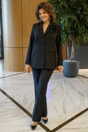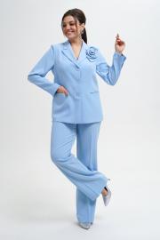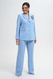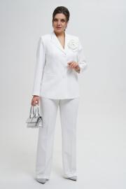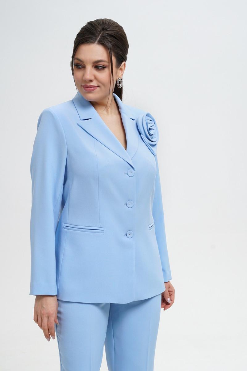 Жакет полуприлегающего силуэта, частично на подкладке (перед, спинка), с центральной застёжкой на петли, пуговицы. Декорированный съёмным украшением.