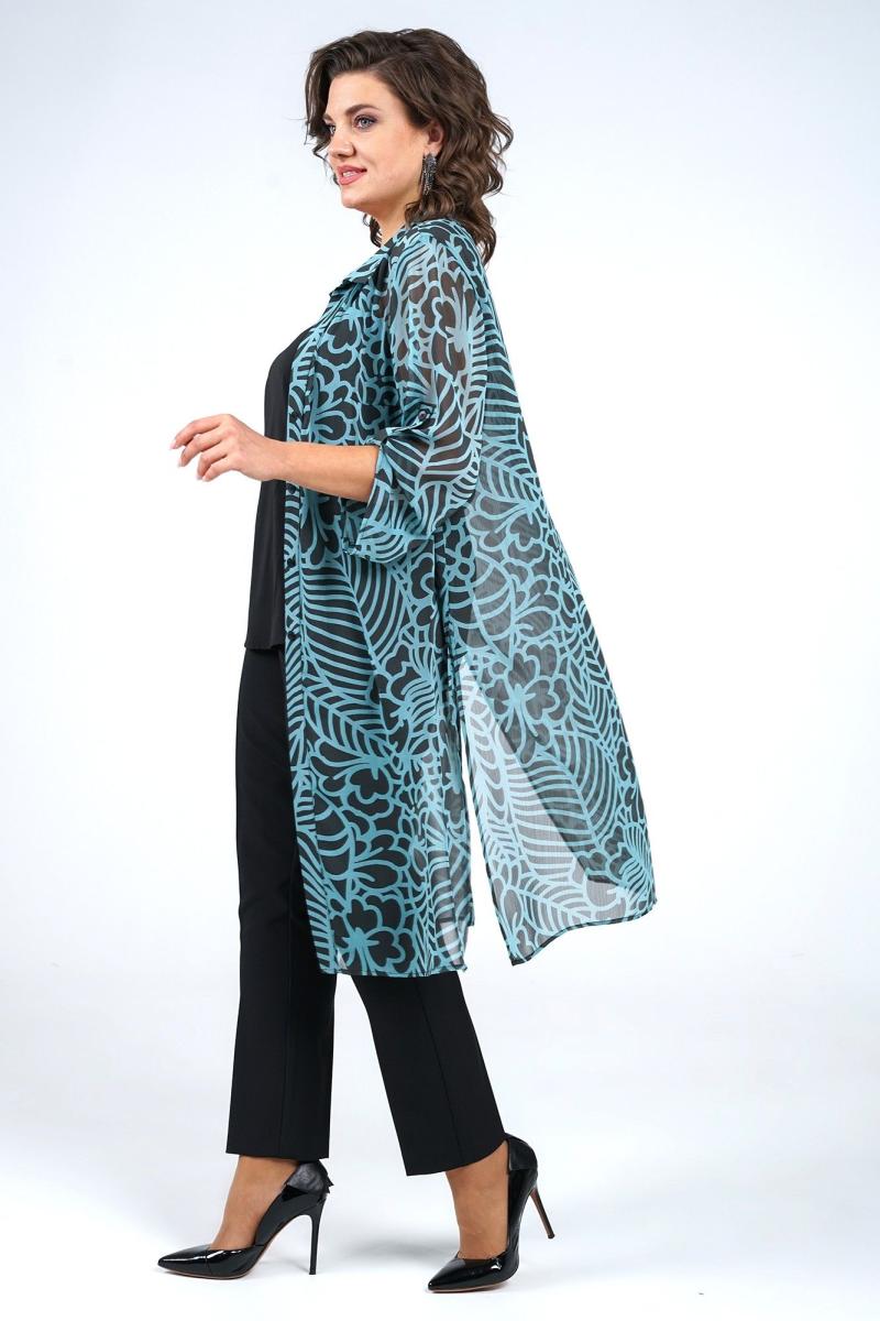 Комплект женский 3-х предметный состоит из блузона, блузы и брюк. Блузон женский прямого силуэта, с центральной застёжкой по притачной планке на петли и пуговицы, с разрезами по боковым швам. Перед с нагрудными выточками. Рукававтачные,одношовные, длиной ¾, с патами фиксируемые длину рукава на петлю и пуговицу. Воротник стояще-отложной. Блуза женская полуприлегающего силуэта, без рукавов. Перед с нагрудными выточками. Брюки женские длинные, на притачном поясе частично по боковым на резинке,застежка типа «гульфик» на тесьму-молнию и по краю пояса на петлю и пуговицу. Передние части с имитацией косых карманов с отрезным бочком. Задние части с талевыми вытачками.