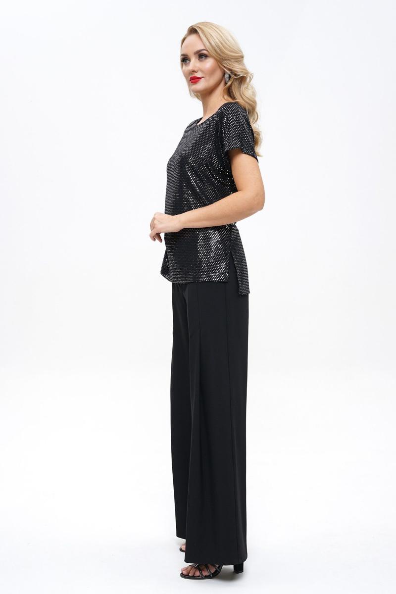 Комплект женский 2-х предметный состоит из блузы и брюк. Блуза женская прямого, свободного силуэта, со спученной линией плеча, с разно-уровневым низом (спинка длиннее на 4,0см), по боковым с разрезами. Брюки женские полуприлегающие силуэта по бёдрам и талии, книзу расширенные, на притачном поясе (Р52-56 по боковым на резинке), застёжка типа «гульфик» и на петлю и пуговицу по поясу. Передние части с мягкой застроченной складкой от линии талии и чуть ниже линии бёдер. Задние части с талевыми выточками.
