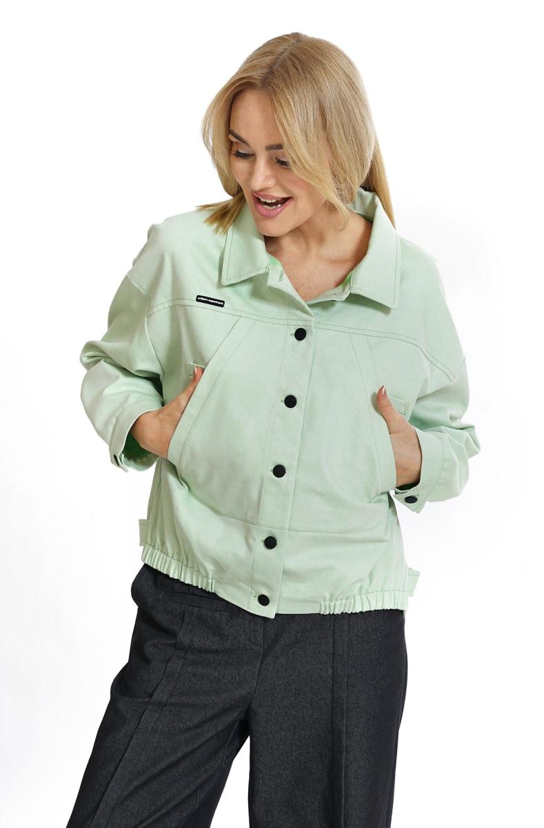 Жакет свободного прямого силуэта, со спущенной линией плеча, с разноуровневым низом, по низу переда резинке, с застёжкой по переду и спинке на пробивные петли и пуговицы, понизу боковых швов спинки паты, пристегивающиеся на пробивные петли и пуговицы. По переду и спинке притачные кокетки. Перед с накладными нагрудными карманами. Рукава втачные, двухшовные, длинные, понизу с разрезом, мягкой складкой и притачными манжетами на пробивную петлю и пуговицу. Воротник отложной. Брюки прямого силуэта, на притачном поясе со шлёвками, с застёжкой типа «гульфик» на молнию и по краю пояса на петлю, пуговицу, в боковых швах карманы. Передние части с отстроченными складками и имитация горизонтальных карманов с листочкой. Задние части с талевыми выточками