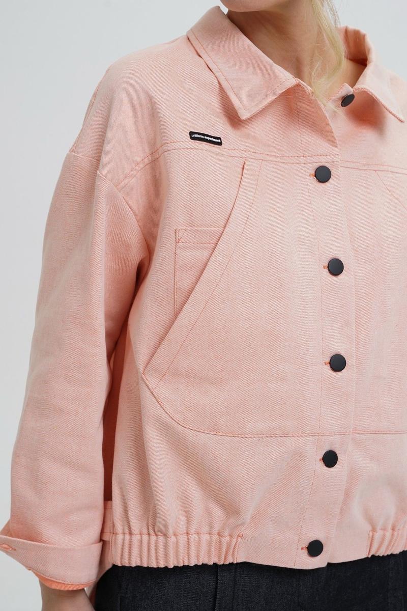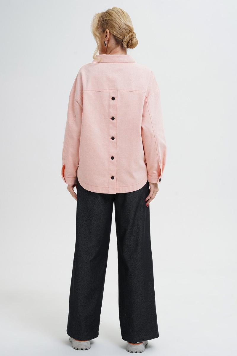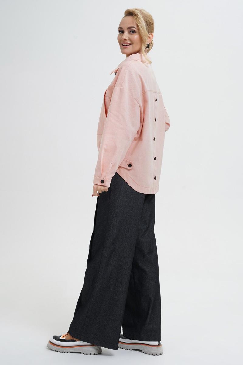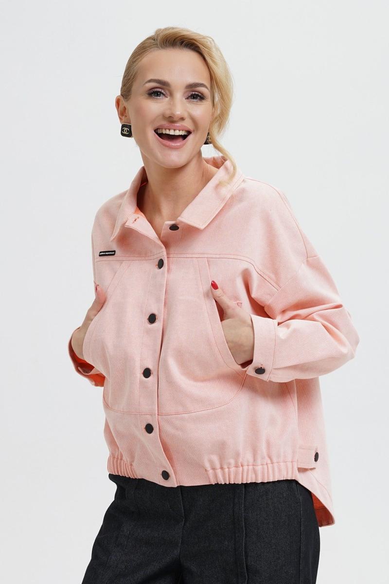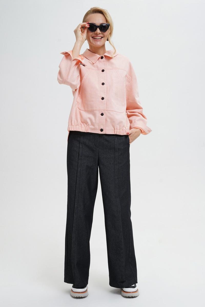 Жакет свободного прямого силуэта, со спущенной линией плеча, с разноуровневым низом, по низу переда резинке, с застёжкой по переду и спинке на пробивные петли и пуговицы, понизу боковых швов спинки паты, пристегивающиеся на пробивные петли и пуговицы. По переду и спинке притачные кокетки. Перед с накладными нагрудными карманами. Рукава втачные, двухшовные, длинные, понизу с разрезом, мягкой складкой и притачными манжетами на пробивную петлю и пуговицу. Воротник отложной.