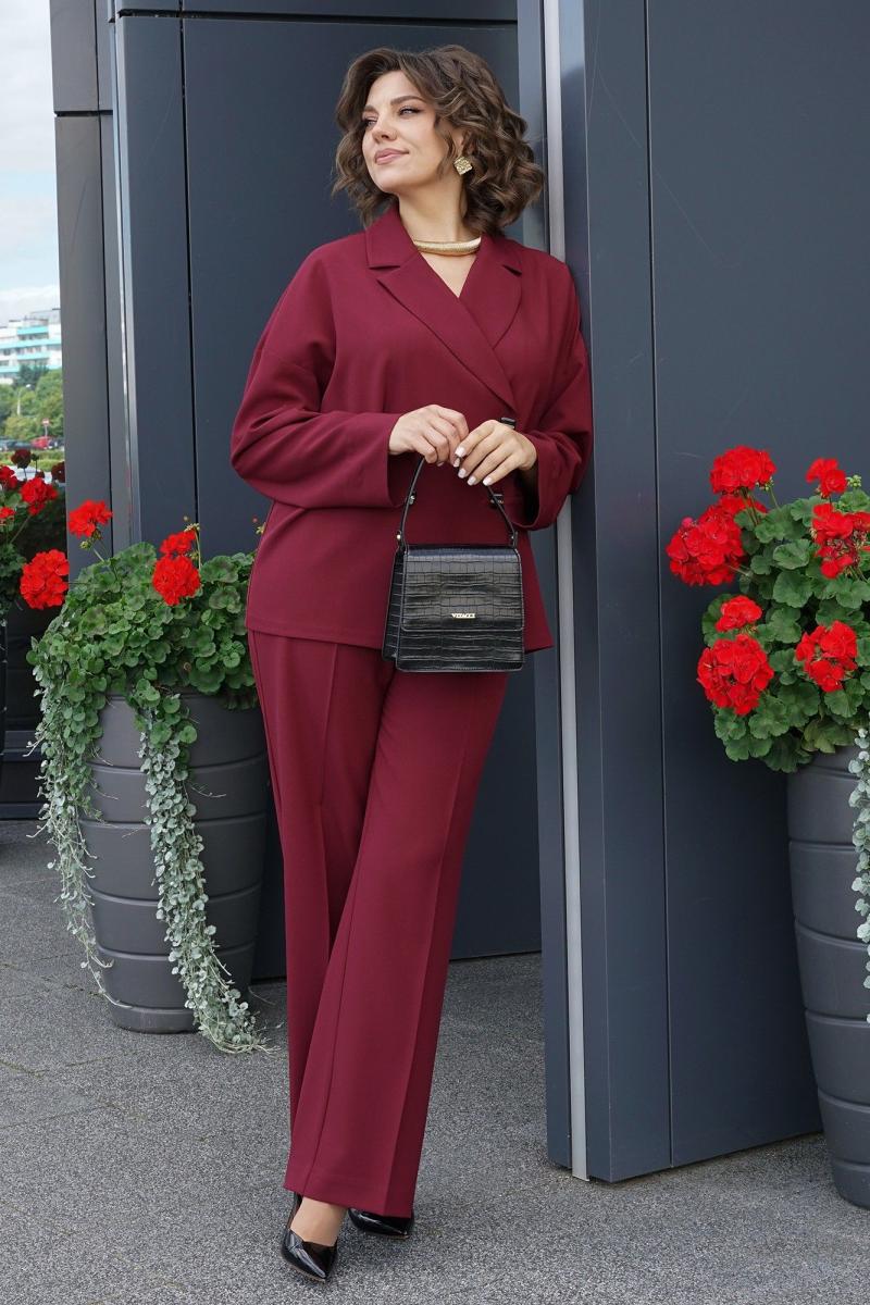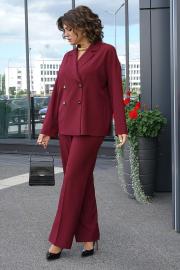 Брюки прямого силуэта, со сгибом, на притачном поясе с резинкой по боковым. Застёжка типа «гульфик» на молнию и петлю, пуговицу по краю пояса. Передние части с имитацией боковых косых карманов. Задние части с талевыми выточками.