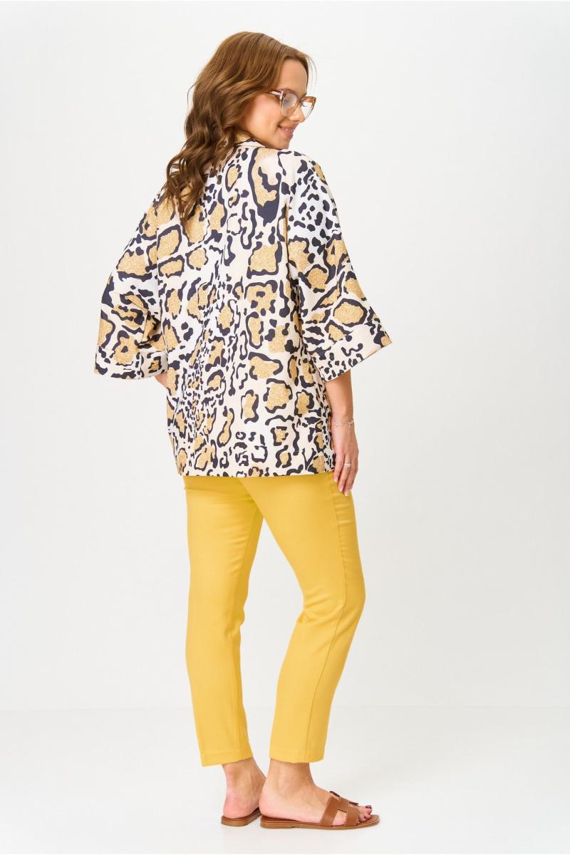 Комплект женский состоящий из блузы , жакета и брюк. Блуза женская из хлопка полуприлегающего силуэта длиной до линии бедра для повседневной носки и торжественных случаев . Горловина топа с разрезом в форме капли . Разрез застегивается на потайную кнопку . Рукава вточные . Жакет однобортный с воротником пиджачного типа и цельнокроеным рукавом 3/4 для повседневной носки и торжественных случаев. Жакет свободный , прямого силуэта с центральной застежкой на 3 петли и пуговицы . Длина изделия чуть ниже линии бедра .Брюки женские полуприлегающего силуэта из текстильного полотна с застежкой на тесьму- молнию и застежкой на петлю и пуговицу , боковыми карманами . Низ брюк с подгипкой .