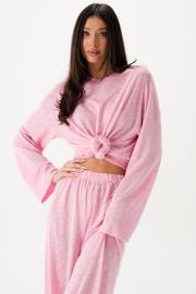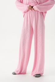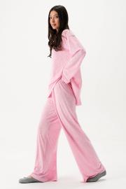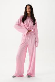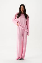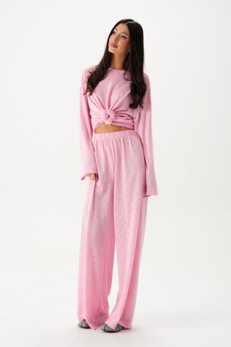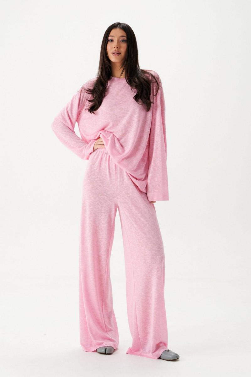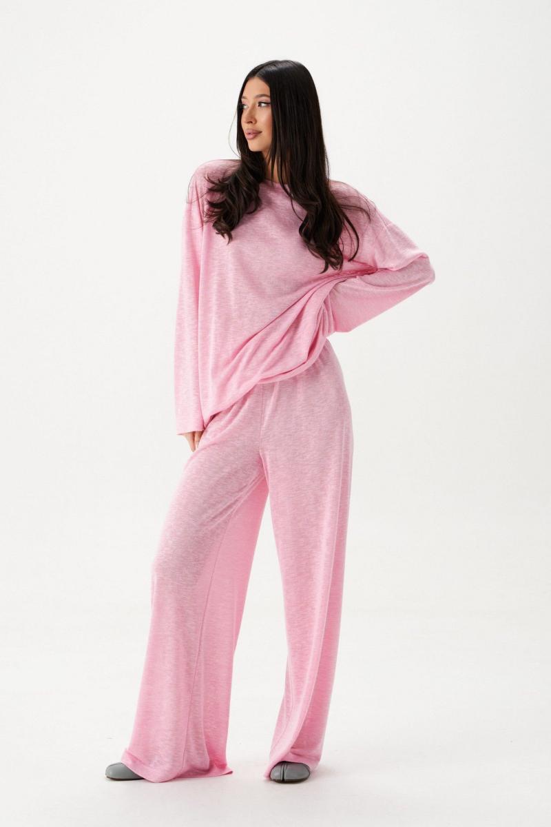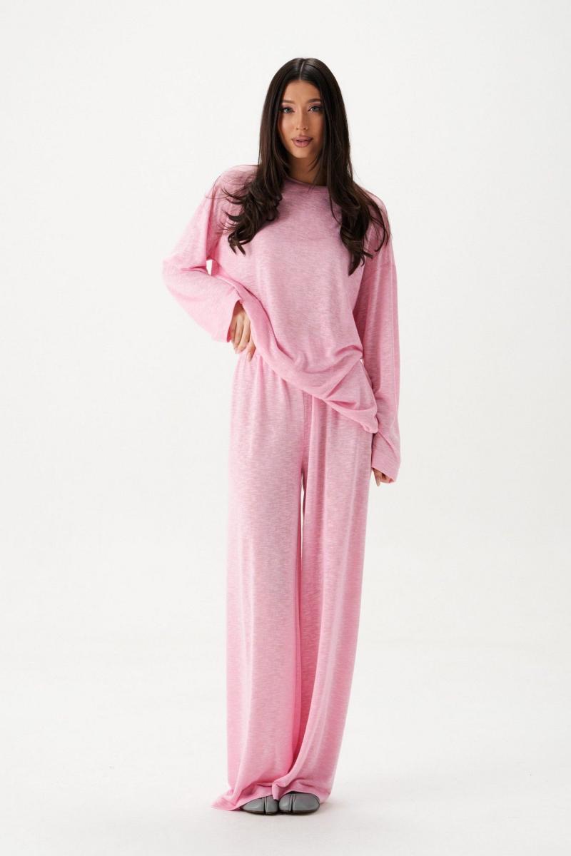 Комплект состоит из джепера и брюк выполнен из полупрозрачного полотна розового цвета. Характеристики: джемпер прямого свободного кроя, овальный широкий вырез горловины, рукав спущен. Длина по спинке от края горловины 72 см, длина рукава от края горловины 75 см. Брюки прямого, свободного кроя, пояс брюк на резинке. Длина брюк по боковой линии - 110 см.