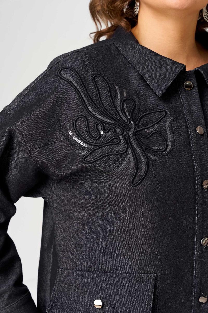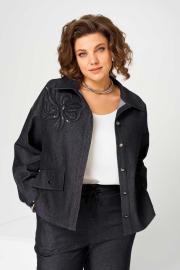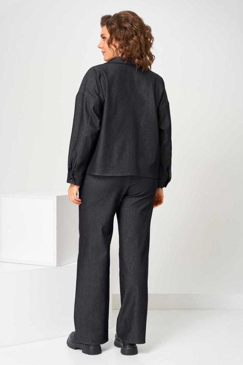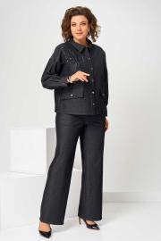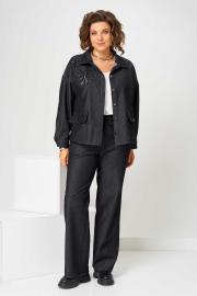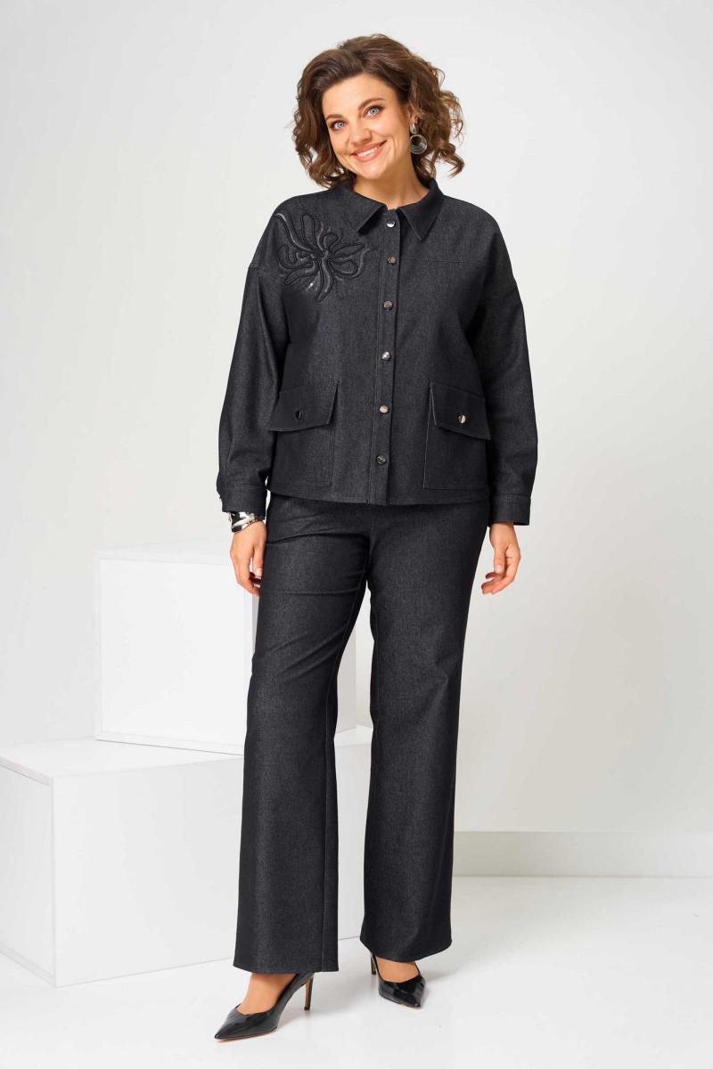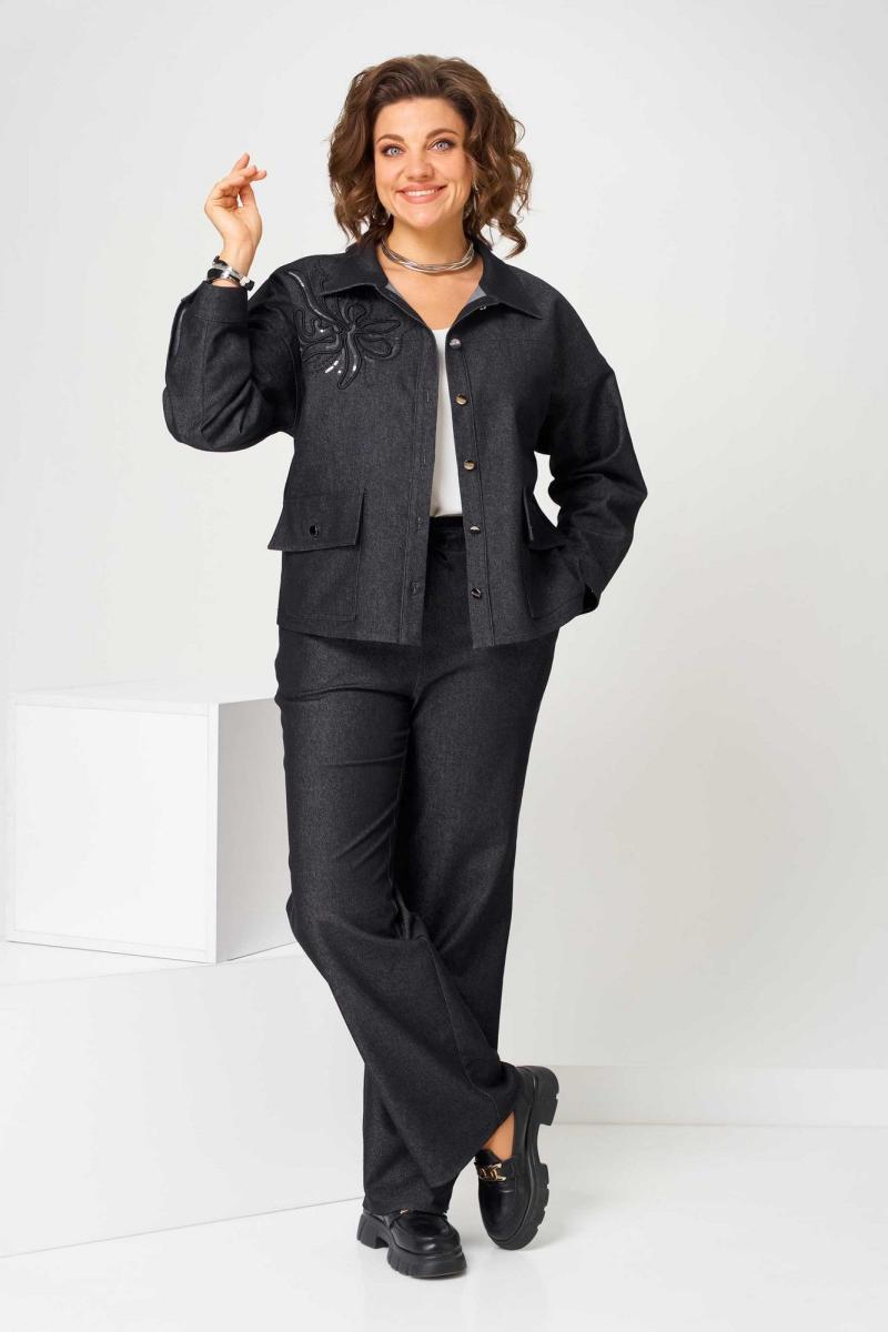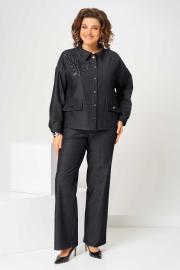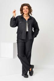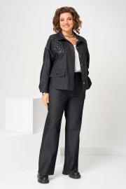 Костюм брючный (двойка) женский свободного силуэта, состоит из жакета и брюк. По переду жакета кокетка с вышивкой. Жакет свободного кроя со спущенным рукавом с манжетом. Карманы на жакете накладные с клапаном. Застежка центральная на петлю-пуговицу. Воротник отложной. Спинка со средним швом. Брюки прямые, в боковых швах карманы. Пояс на резинке с кулиской. Длина изделия жакет - 57 (±1) см., брюки - 101 (±2) см. Длина рукава 71 (±1) см. от шва Объём груди жакет: размер 50 – 118 (±2) см.; размер 52 – 122 (±2) см.; размер 54 – 126 (±2) см. Объём талии жакет: размер 50 – 118 (±1) см. размер 52 – 122 (±1) см. размер 54 – 126 (±1) см. брюки: размер 50 – 86 (±2) см.; размер 52 – 90 (±2) см.; размер 54 – 94 (±2) см. Объём бёдер жакет: размер 50 – 118 (±1) см. размер 52 – 122 (±1) см. размер 54 – 11 (±1) см. брюки: размер 50 – 108 (±2) см.; размер 52 – 112(±2) см.; размер 54 – 116 (±2) см.