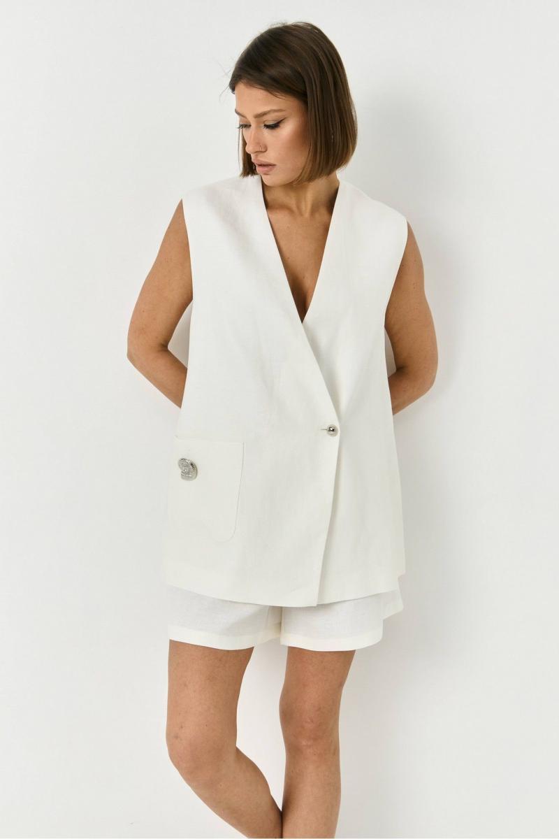 Комплект двойка из льна. Комплект состоит из жилетки и шорт. Жилетка двубортная, функциональный карман с декоративным элементом. Шорты на резинке, по бокам функциональные карманы.
