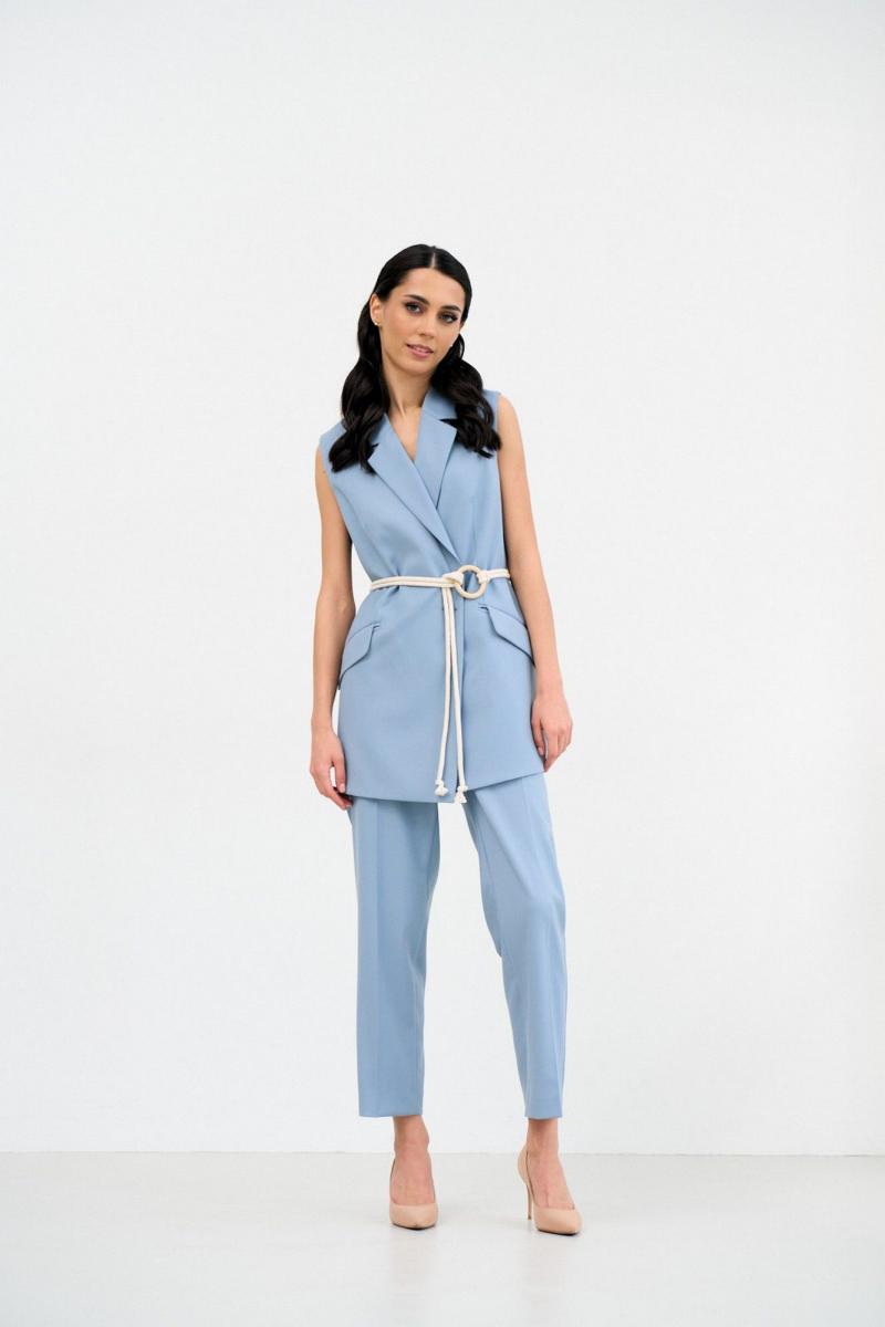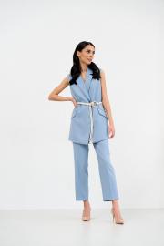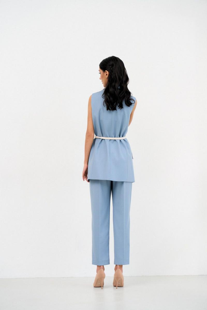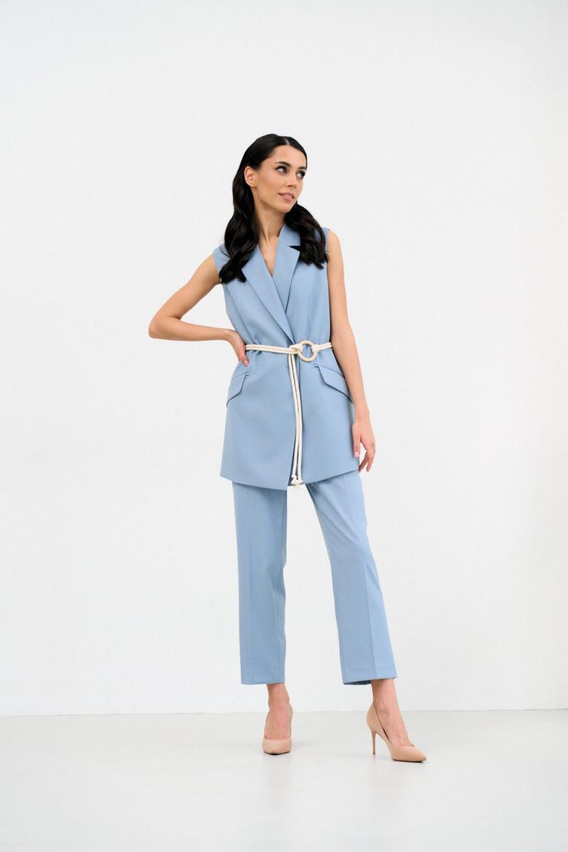 Комплект женский с удлиненным жилетом и брюками в классическом стиле. Жилет прямого кроя, застежка на пуговицу, по переду небольшие вытачки, по бокам изделия карманы, в комплекте съемный пояс. Брюки классического кроя на резинке.